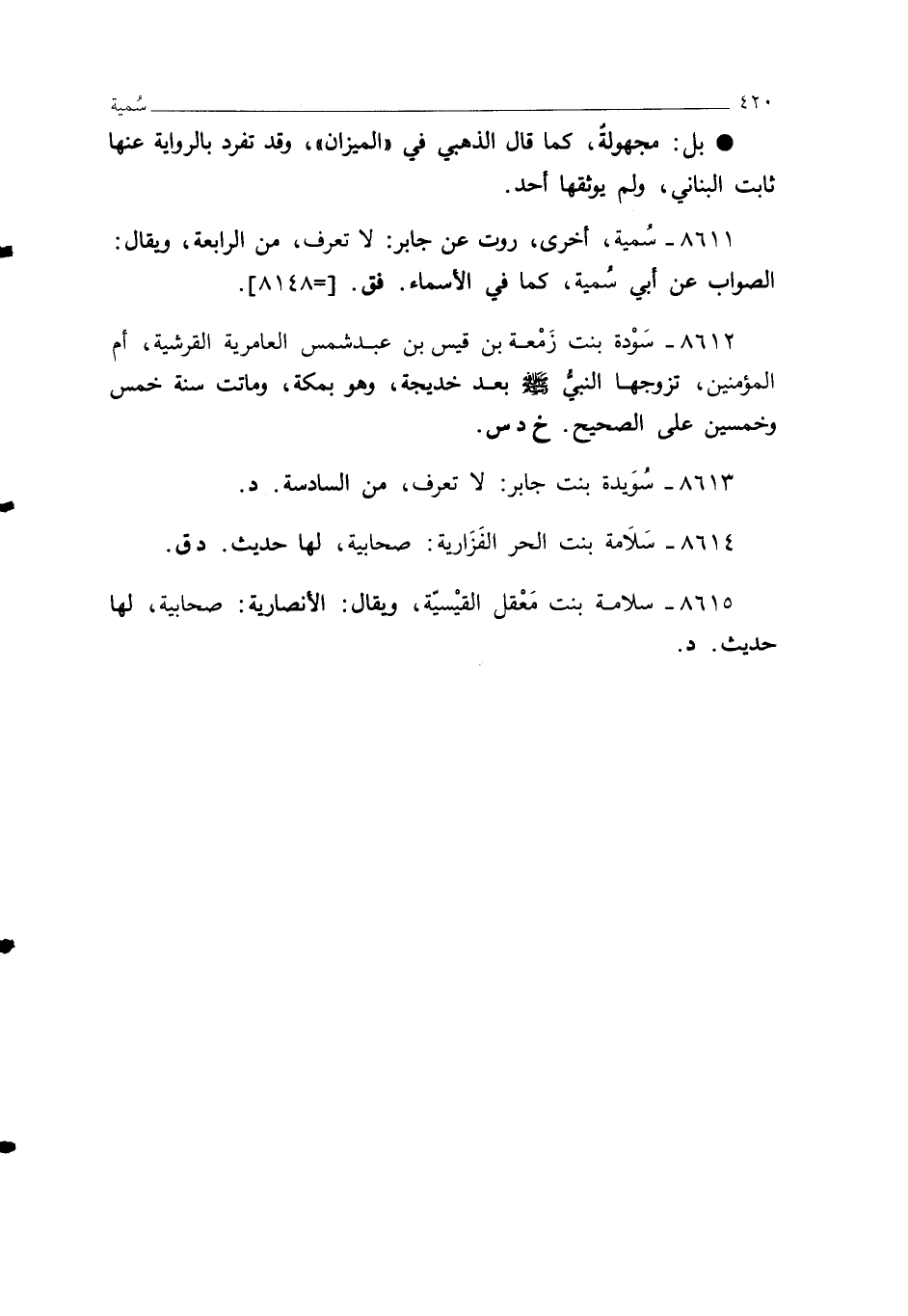 8611 - سُمية، أخرى، روت عن جابر: لا تعرف، من الرابعة، ويقال: الصواب عن أبي سُمية، كما في الأسماء. فق. [=8148].