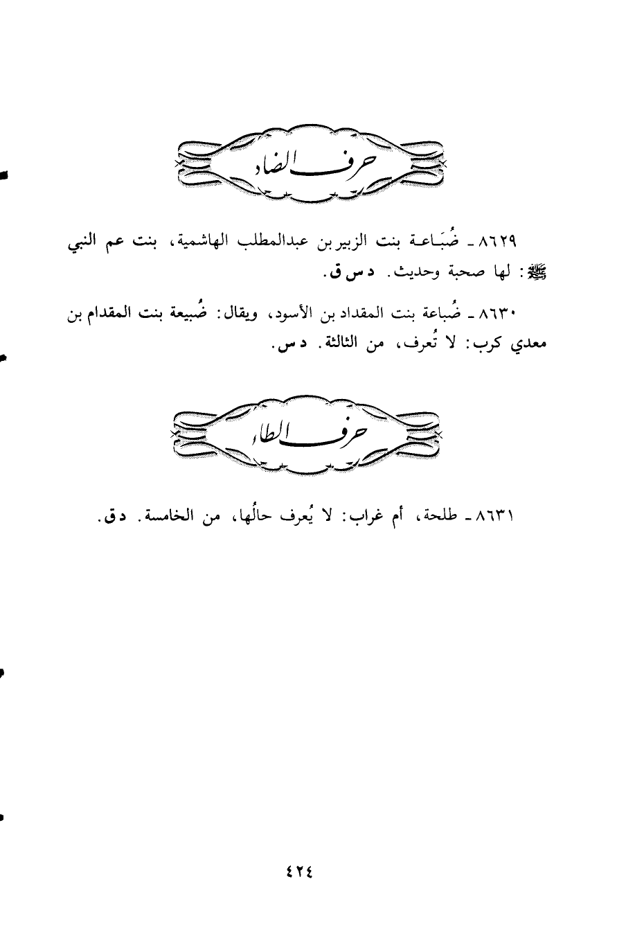 8629 - ضُبَاعة بنت الزبير بن عبد المطلب الهاشمية، بنت عم النبي - صلى الله عليه وسلم -: لها صحبة وحديث. د س ق.