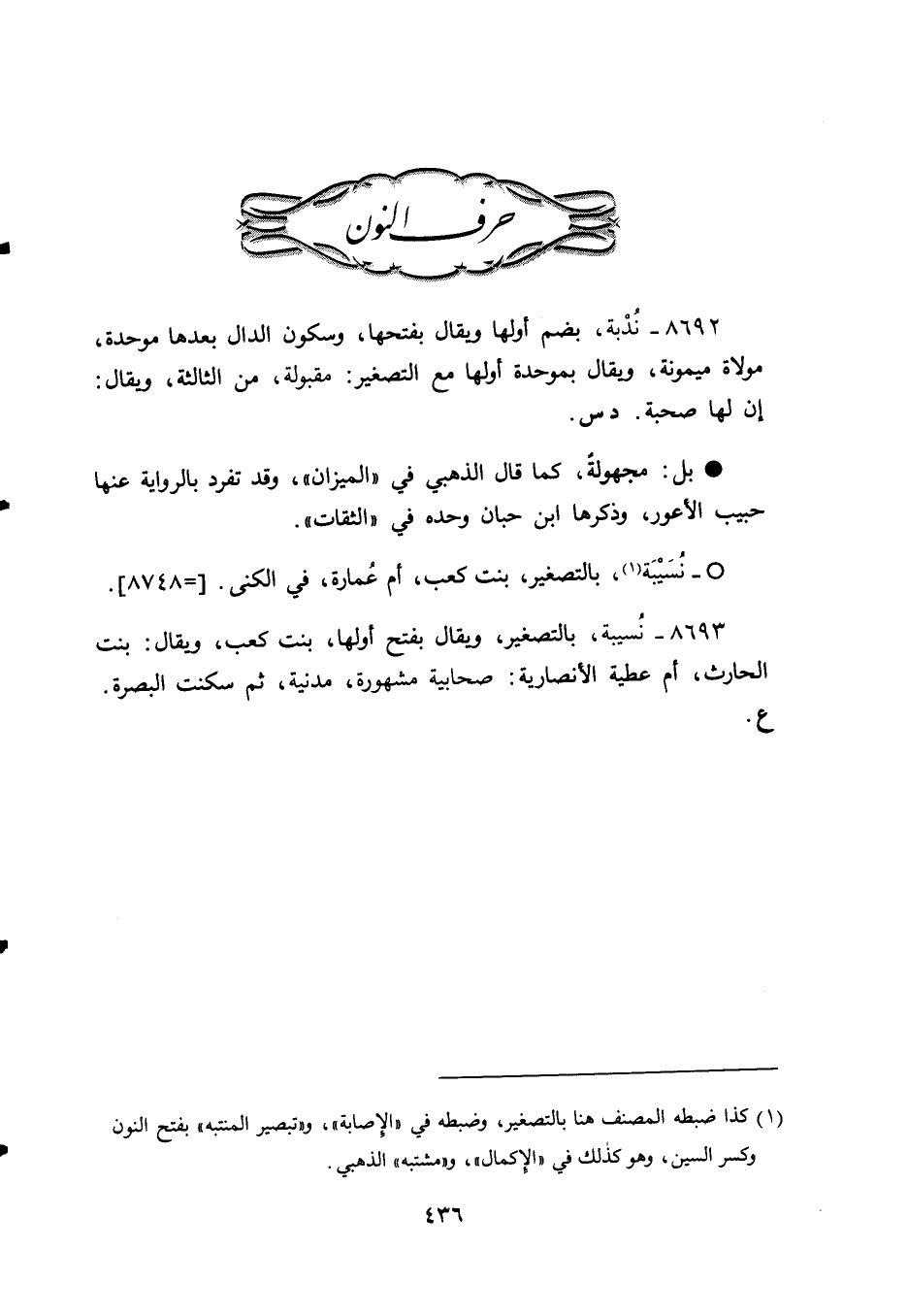° - نُسَيْبَة (¬1)، بالتصغير، بنت كعب، أم عُمارة، في الكنى. [=8748].