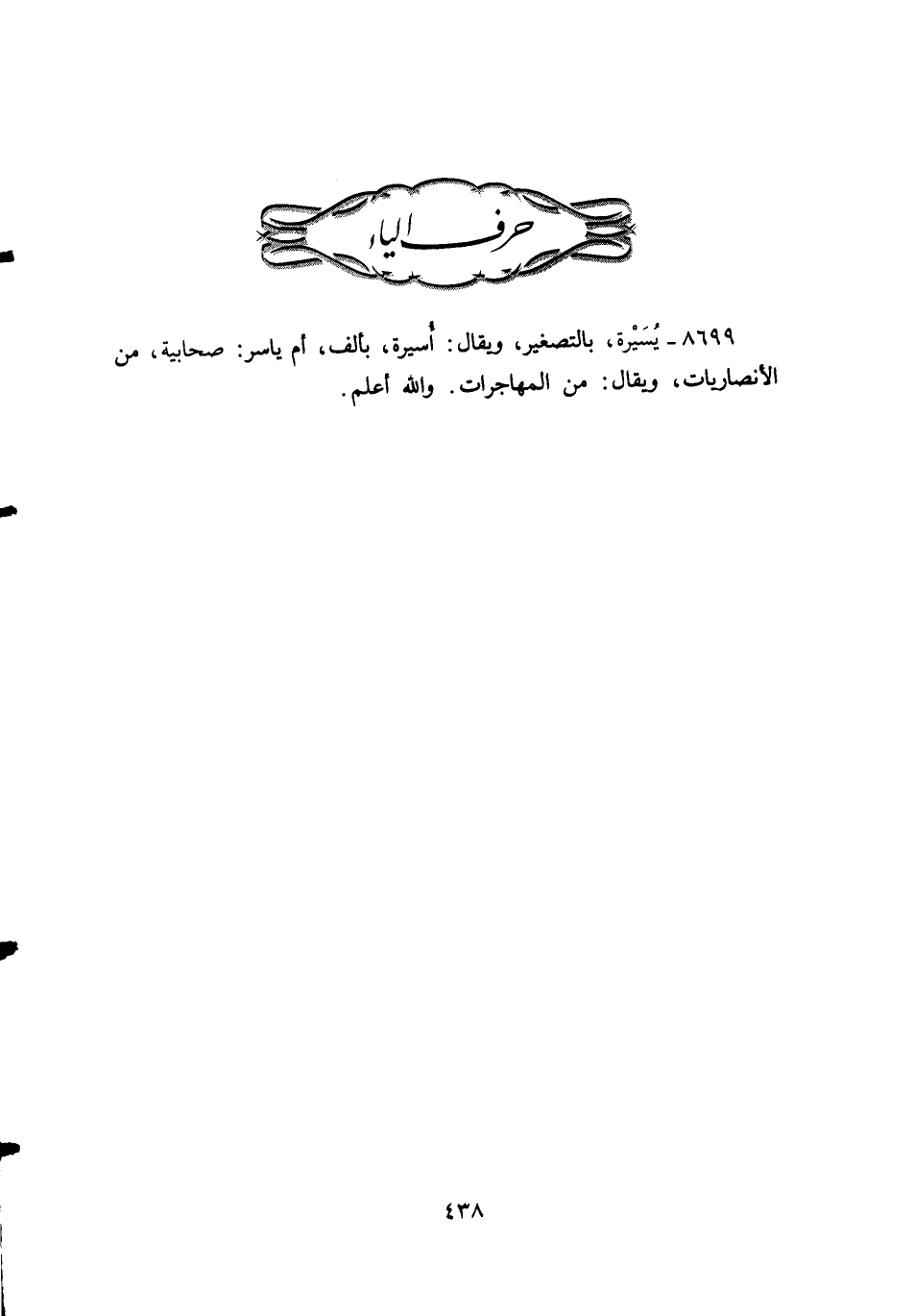 8699 - يُسَيْرة، بالتصغير، ويقال: أُسيرة، بألف، أم ياسر: صحابية، من الأنصاريات، ويقال: من المهاجرات. والله أعلم.