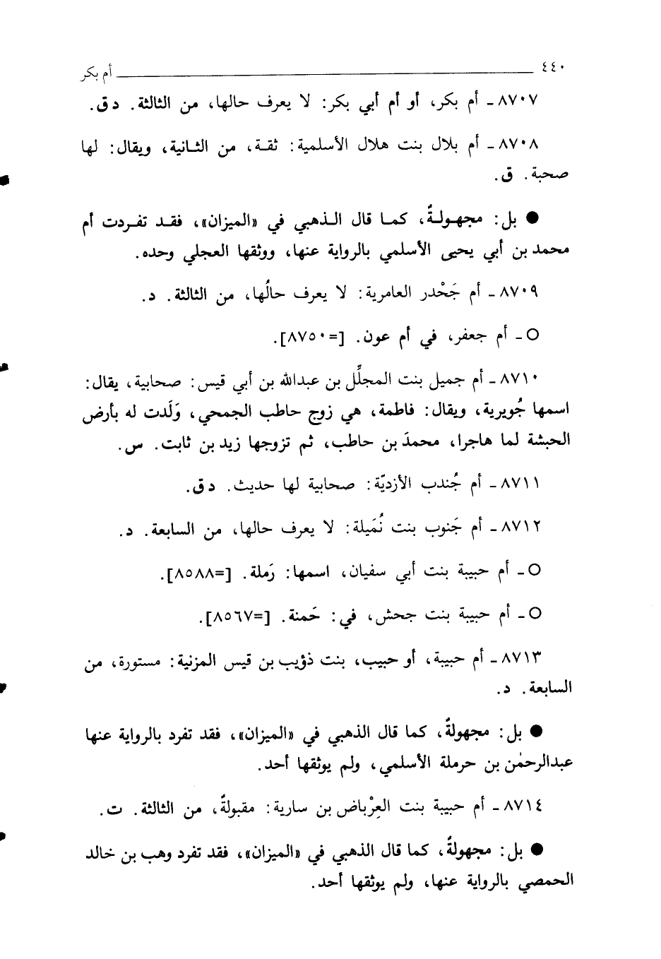 8708 - أم بلال بنت هلال الأسلمية: ثقة، من الثانية، ويقال: لها صحبة. ق.