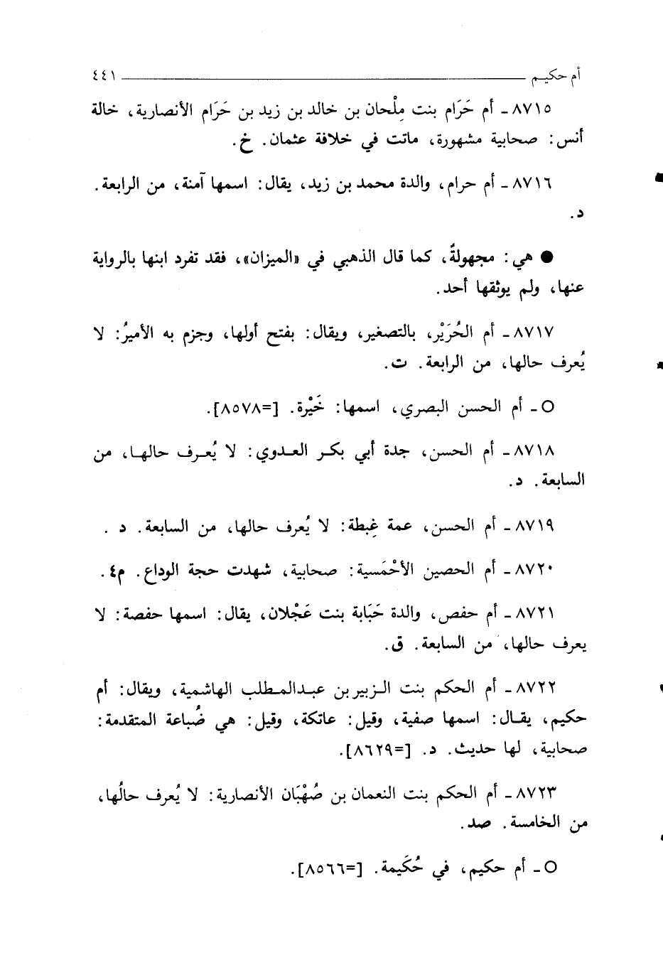 8722 - أم الحكم بنت الزبير بن عبد المطلب الهاشمية، ويقال: أم حكيم، يقال: اسمها صفية، وقيل: عاتكة، وقيل: هي ضُباعة المتقدمة: صحابية، لها حديث. د. [=8629].