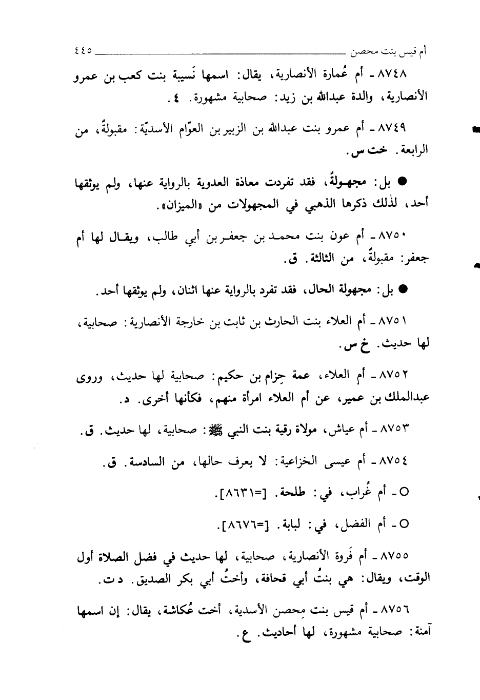 8756 - أم قيس بنت مِحصن الأسدية، أخت عُكاشة، يقال: إن اسمها آمنة: صحابية مشهورة، لها أحاديث. ع.