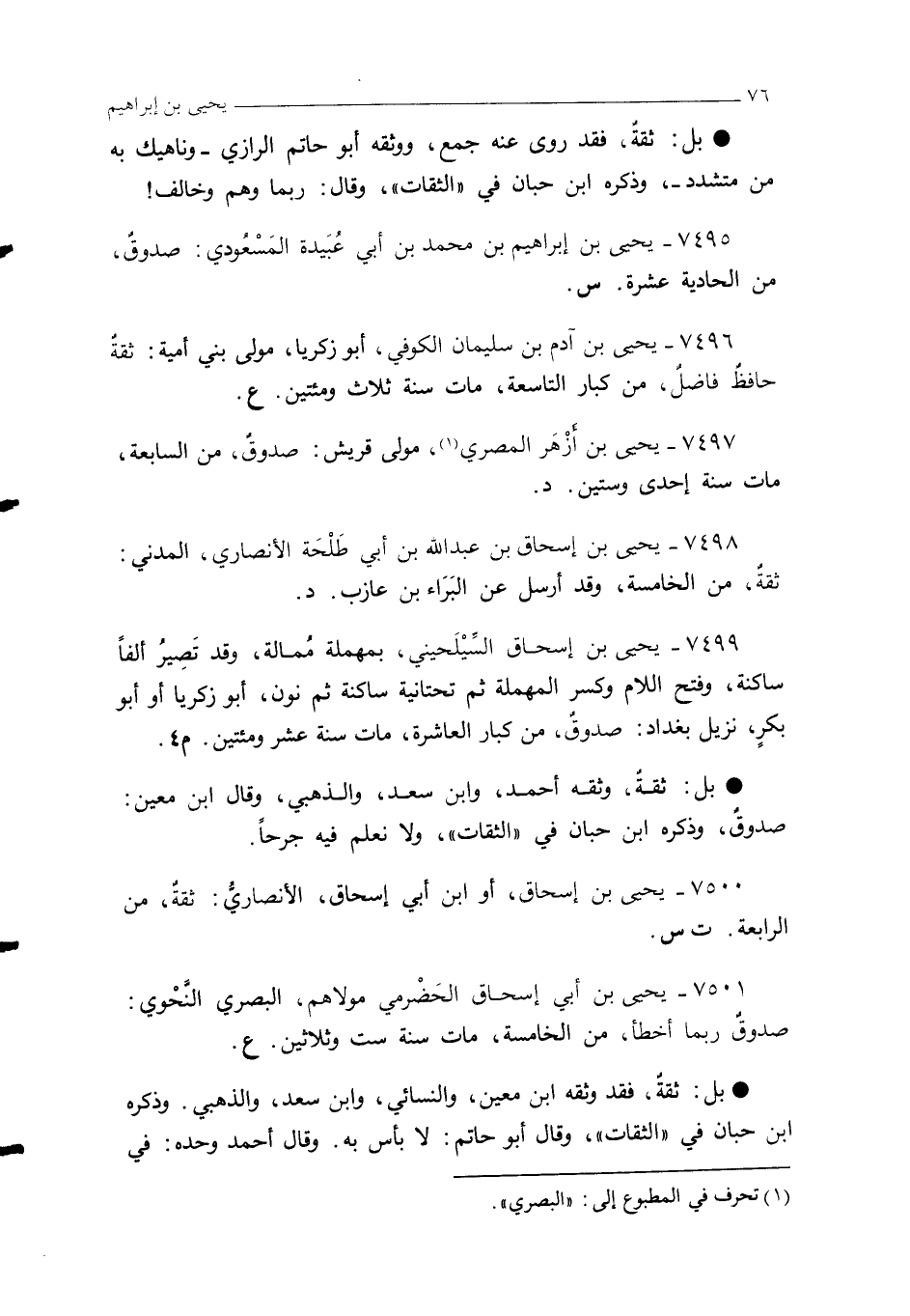 7500 - يحيى بن إسحاق، أو ابن أبي إسحاق، الأنصاريُّ: ثقة، من الرابعة. ت س.