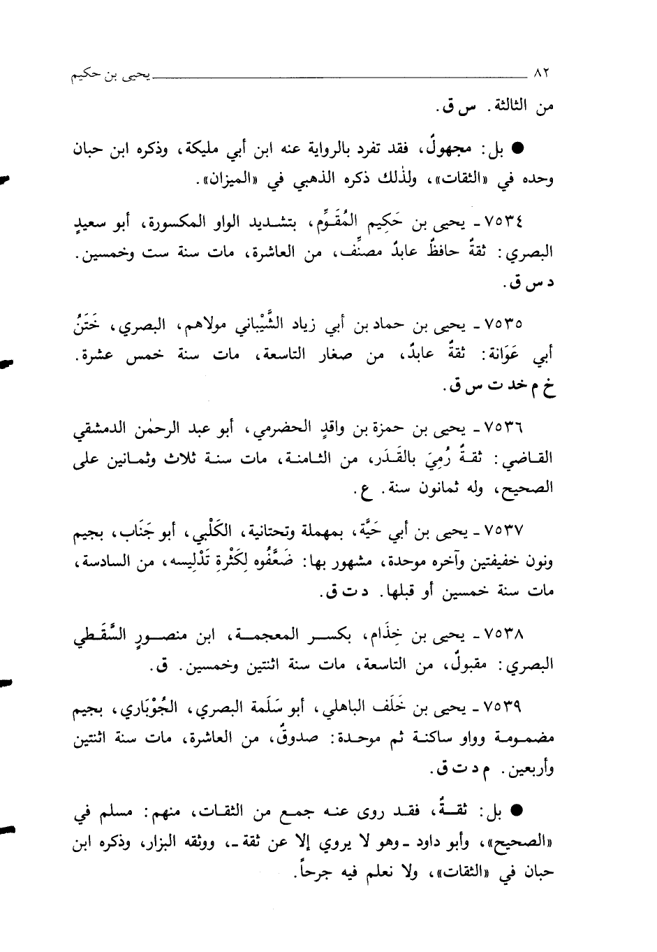 7534 - يحيى بن حَكِيم المُقَوِّم، بتشديد الواو المكسورة، أبو سعيدٍ البصري: ثقةٌ حافظ عابدٌ مصنِّف، من العاشرة، مات سنة ست وخمسين. د س ق.
