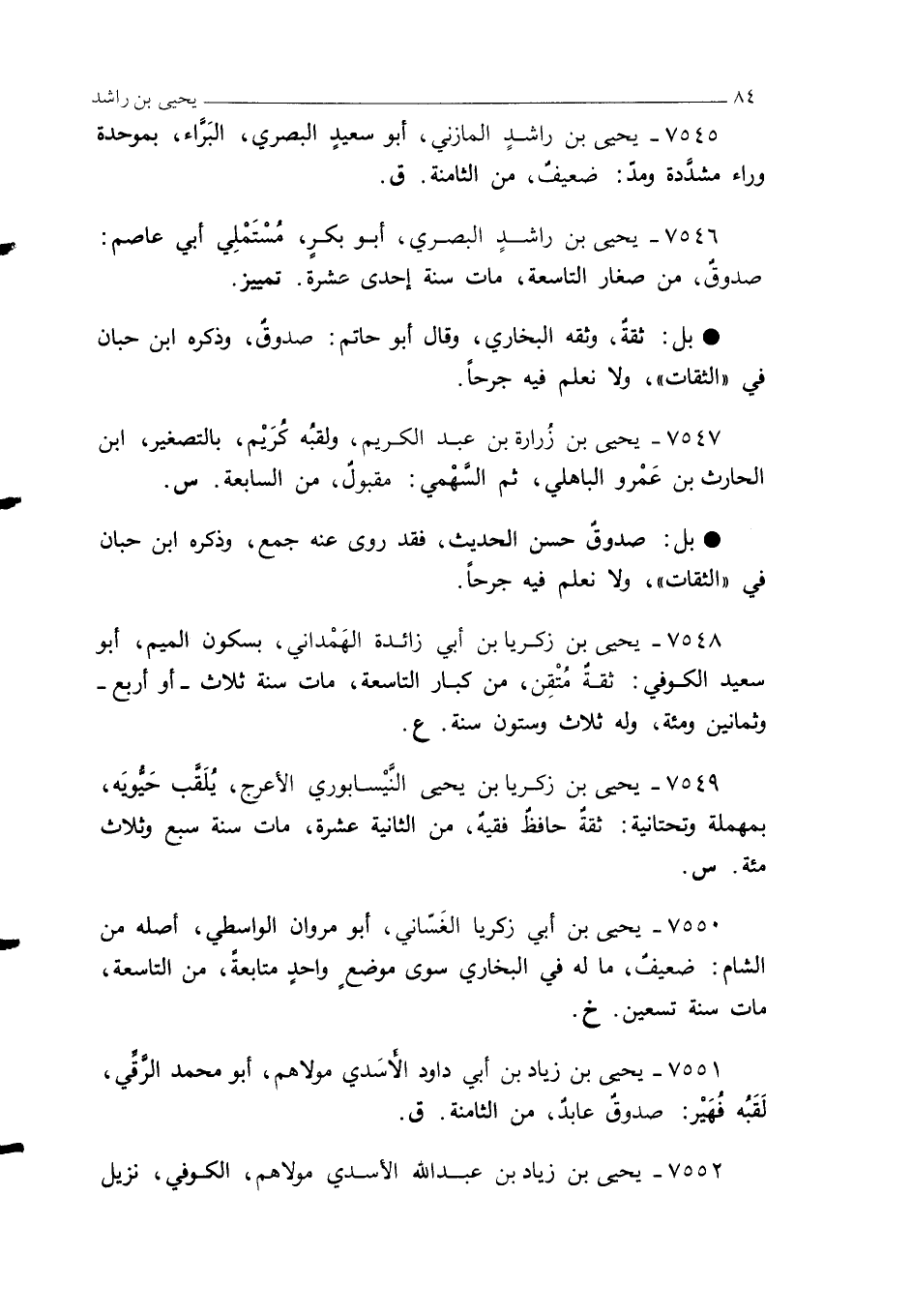 7545 - يحيى بن راشدٍ المازني، أبو سعيدٍ البصري، البَرَّاء، بموحدة وراء مشدَّدة ومدّ: ضعيفٌ، من الثامنة. ق.