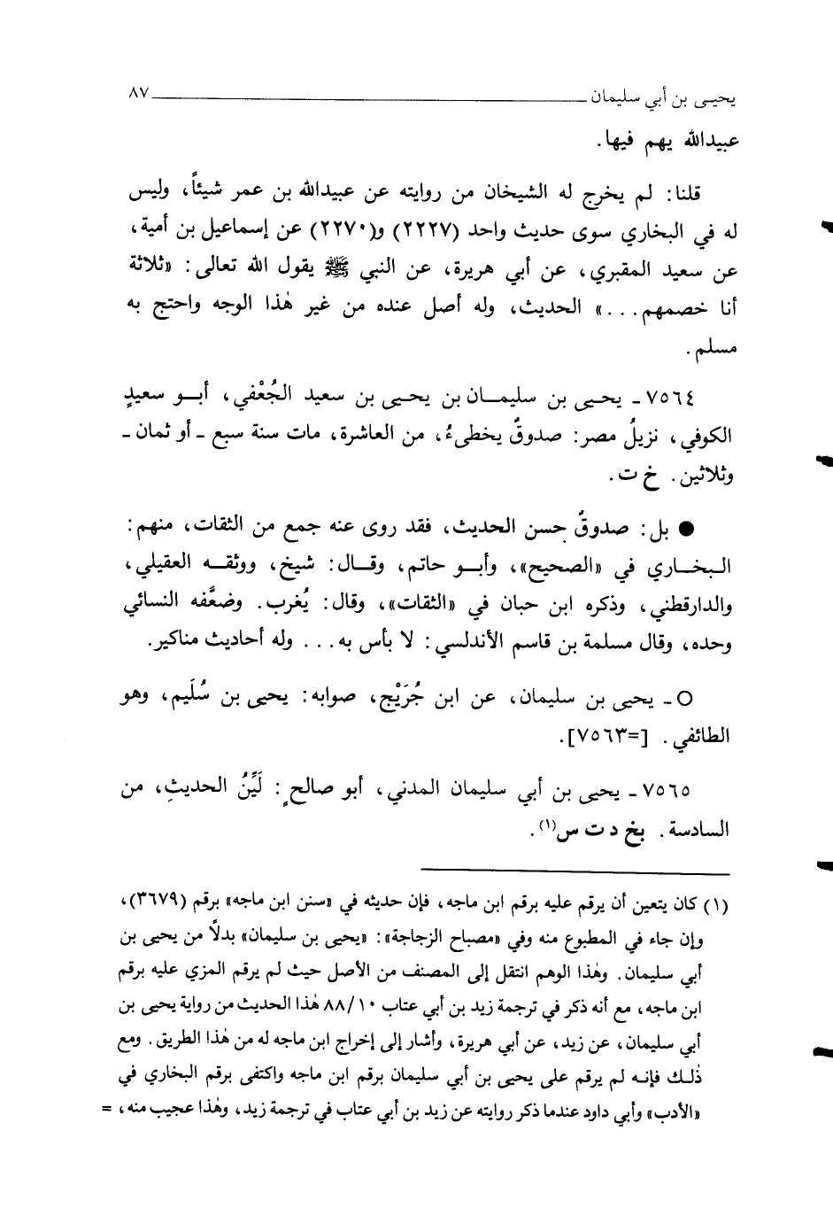 7564 - يحيى بن سليمان بن يحيى بن سعيد الجُعْفي، أبو سعيدٍ الكوفي، نزيلُ مصر: صدوقٌ يخطئُ، من العاشرة، مات سنة سبع - أو ثمان - وثلاثين. خ ت.