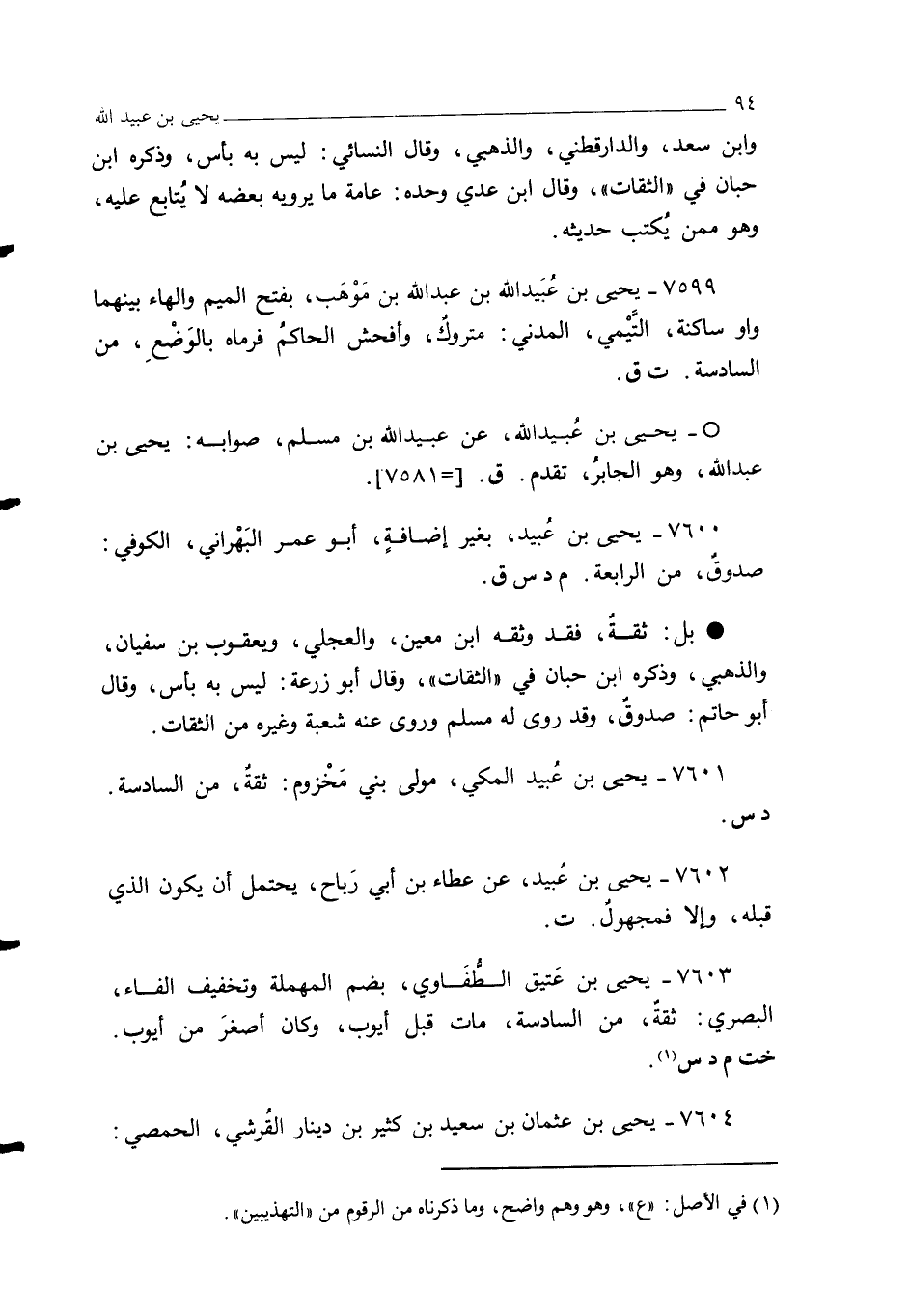7603 - يحيى بن عَتيق الطُّفَاوي، بضم المهملة وتخفيف الفاء، البصري: ثقةٌ، من السادسة، مات قبل أيوب، وكان أصغرَ من أيوب. خت م د س (¬1).
