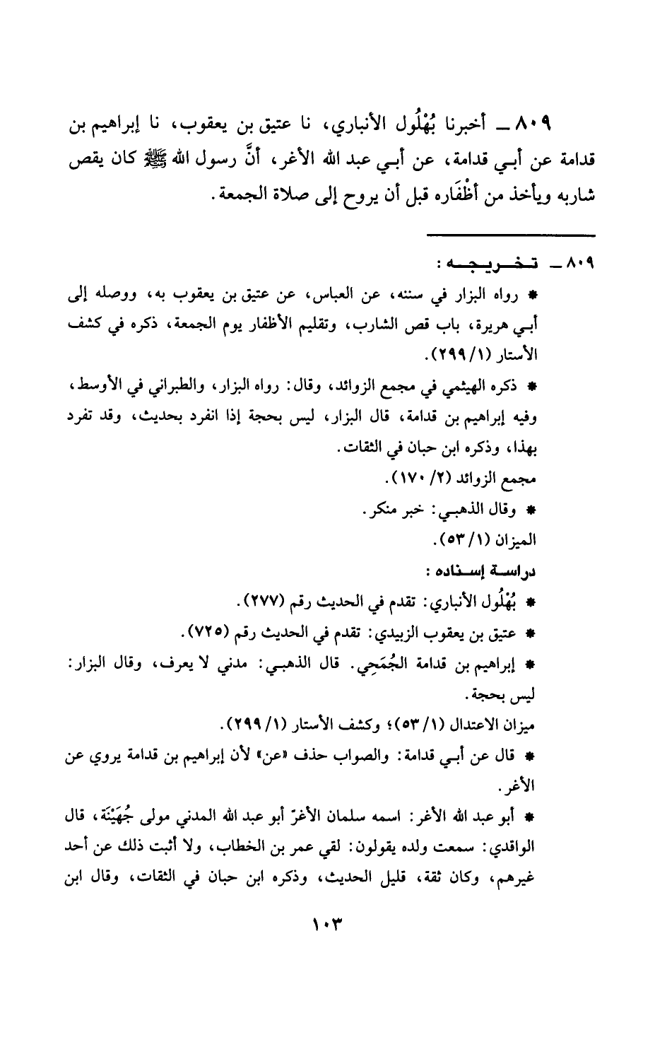 809 - أَخْبَرَنَا بُهْلُولٌ الْأَنْبَارِيُّ، نَا عَتِيقُ بْنُ يَعْقُوبَ، نَا إِبْرَاهِيمُ بْنُ قُدَامَةَ، عَنْ أَبِي قُدَامَةَ، عَنْ أَبِي عَبْدِ اللَّهِ الْأَغَرِّ، §أَنَّ رَسُولُ اللَّهِ صَلَّى اللهُ عَلَيْهِ وَسَلَّمَ كَانَ يَقُصُّ شَارِبَهُ، وَيَأْخُذُ مِنْ أَظْفَارِهِ، قَبْلَ أَنْ يَرُوحَ إِلَى صَلَاةِ الْجُمُعَةِ