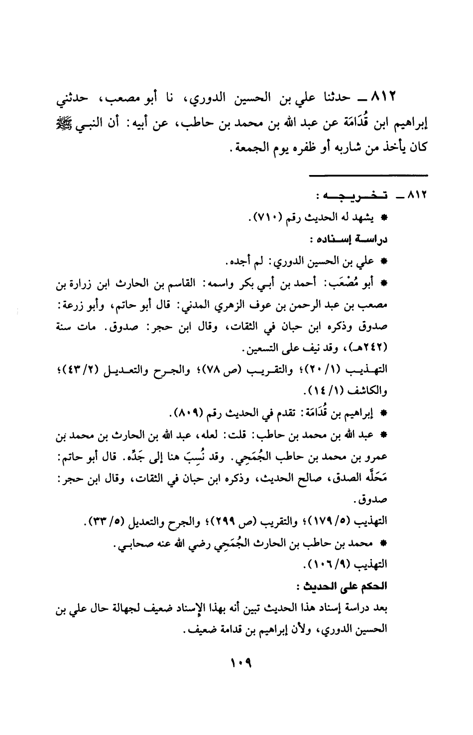 812 - حَدَّثَنَا عَلِيُّ بْنُ الْحُسَيْنِ الدُّورِيُّ، نَا أَبُو مُصْعَبٍ، حَدَّثَنِي إِبْرَاهِيمُ بْنُ قُدَامَةَ، عَنْ عَبْدِ اللَّهِ بْنِ الْحَارِثِ بْنِ مُحَمَّدِ بْنِ حَاطِبٍ، عَنْ أَبِيهِ، أَنَّ النَّبِيَّ صَلَّى اللهُ عَلَيْهِ وَسَلَّمَ كَانَ §يَأْخُذُ مِنْ شَارِبِهِ أَوْ ظُفْرِهِ يَوْمَ الْجُمُعَةِ