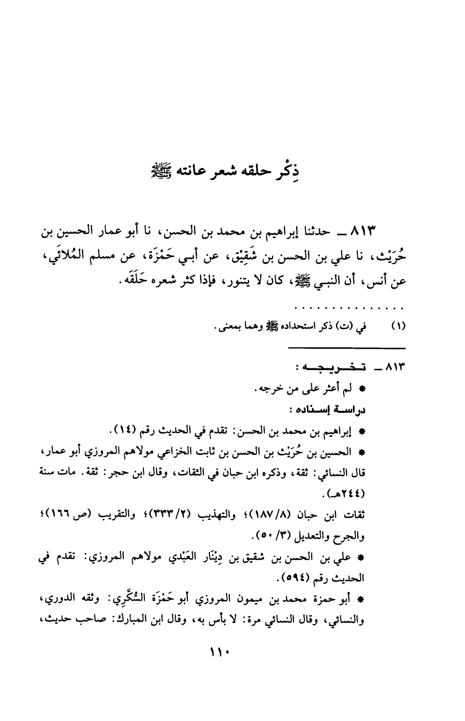 813 - حَدَّثَنَا إِبْرَاهِيمُ بْنُ مُحَمَّدِ بْنِ الْحَسَنِ، نَا أَبُو عَمَّارٍ الْحُسَيْنُ بْنُ حُرَيْثٍ، نَا عَلِيُّ بْنُ الْحَسَنِ بْنِ شَقِيقٍ، عَنْ أَبِي حَمْزَةَ، عَنْ مُسْلِمٍ الْمُلَائِيِّ، عَنْ أَنَسٍ، أَنَّ النَّبِيَّ صَلَّى اللهُ عَلَيْهِ وَسَلَّمَ كَانَ §لَا يَتَنَوَّرُ، فَإِذَا كَثُرَ شَعْرُهُ حَلَقَهُ