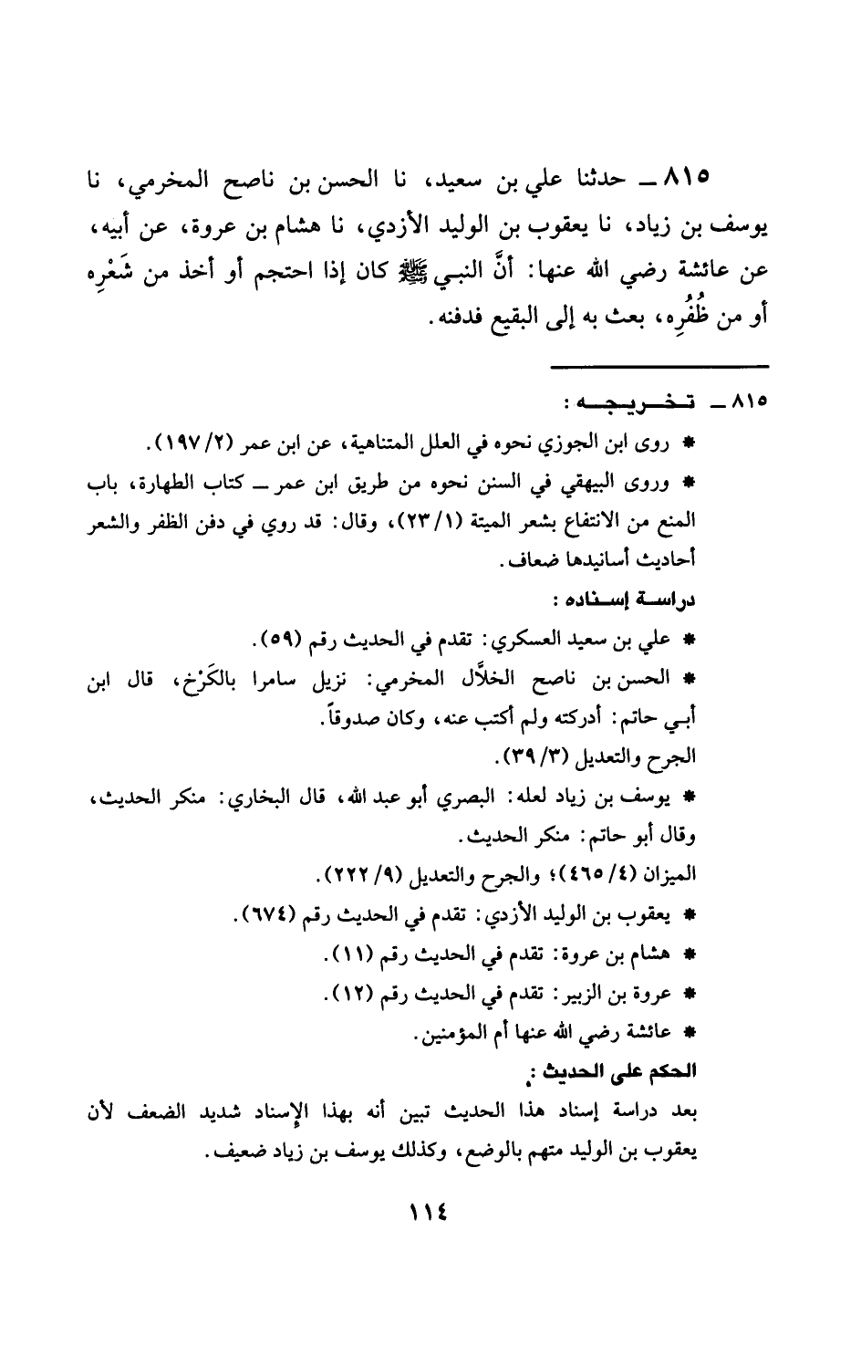 815 - حَدَّثَنَا عَلِيُّ بْنُ سَعِيدٍ، نَا الْحَسَنُ بْنُ نَاصِحٍ الْمُخَرِّمِيُّ، نَا يُوسُفُ بْنُ زِيَادَةَ، نَا يَعْقُوبُ بْنُ الْوَلِيدِ الْأَزْدِيُّ، نَا هِشَامُ بْنُ عُرْوَةَ، عَنْ أَبِيهِ، عَنْ عَائِشَةَ، رَضِيَ اللَّهُ عَنْهَا: أَنَّ النَّبِيَّ صَلَّى اللهُ عَلَيْهِ وَسَلَّمَ كَانَ §إِذَا احْتَجَمَ، أَوْ أَخَذَ مِنْ شَعْرِهِ، أَوْ مِنْ ظُفْرِهِ، بَعَثَ بِهِ إِلَى الْبَقِيعِ فَدَفَنَهُ