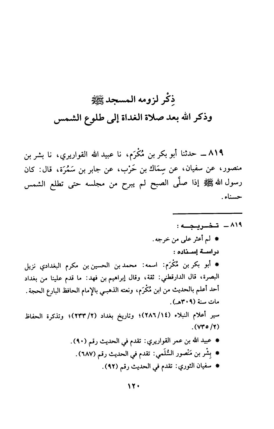 819 - حَدَّثَنَا أَبُو بَكْرِ بْنُ مُكْرَمٍ، نَا عُبَيْدُ اللَّهِ الْقَوَارِيرِيُّ، نَا بِشْرُ بْنُ مَنْصُورٍ، عَنْ سُفْيَانَ، عَنْ سِمَاكِ بْنِ حَرْبٍ، عَنْ جَابِرِ بْنِ سَمُرَةَ، قَالَ: كَانَ رَسُولُ اللَّهِ صَلَّى اللهُ عَلَيْهِ وَسَلَّمَ §إِذَا صَلَّى الصُّبْحَ لَمْ يَبْرَحْ مِنْ مَجْلِسِهِ حَتَّى تَطْلُعَ الشَّمْسُ حَسْنَاءَ