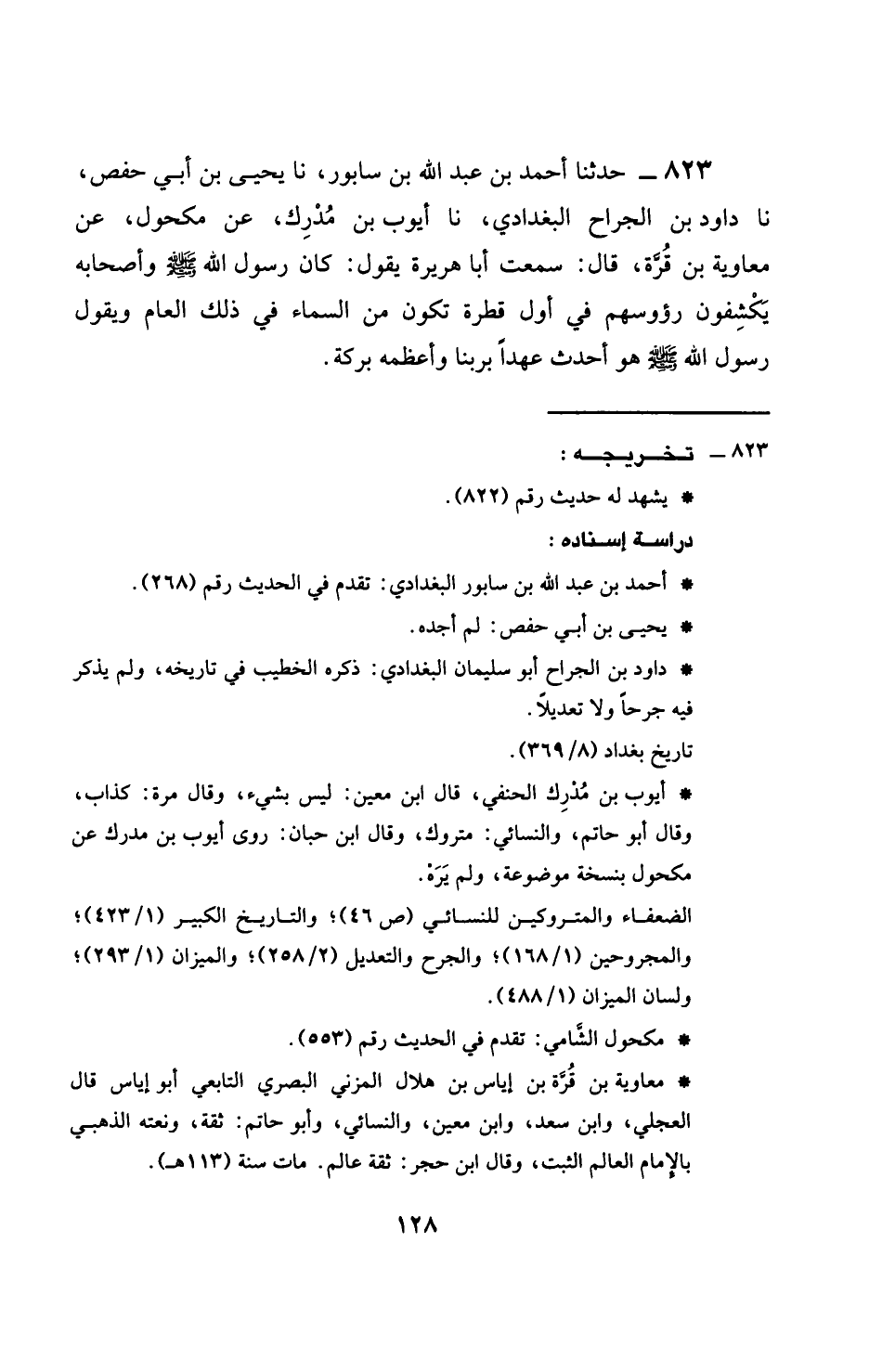 823 - حَدَّثَنَا أَحْمَدُ بْنُ عَبْدِ اللَّهِ بْنِ سَابُورٍ، نَا يَحْيَى بْنُ أَبِي حَفْصٍ، نَا رَوَّادُ بْنُ الْجَرَّاحِ الْبَغْدَادِيُّ، نَا أَيُّوبُ بْنُ مُدْرِكٍ، عَنْ مَكْحُولٍ، عَنْ مُعَاوِيَةَ بْنِ قُرَّةَ، قَالَ: سَمِعْتُ أَبَا هُرَيْرَةَ، يَقُولُ: كَانَ رَسُولُ اللَّهِ صَلَّى اللهُ عَلَيْهِ وَسَلَّمَ وَأَصْحَابُهُ يَكْشِفُونَ رُؤوُسَهُمْ فِي أَوَّلِ قَطْرَةٍ تَكُونُ مِنَ السَّمَاءِ فِي ذَلِكَ الْعَامِ، وَيَقُولُ رَسُولَ اللَّهِ صَلَّى اللهُ عَلَيْهِ وَسَلَّمَ: §هُوَ أَحْدَثُ عَهْدٍ بِرَبِّنَا، وَأَعْظَمُهُ بَرَكَةً
