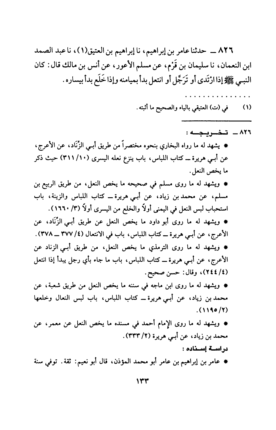 826 - حَدَّثَنَا عَامِرُ بْنُ إِبْرَاهِيمَ، نَا إِبْرَاهِيمُ بْنُ الْعَتِيقِ، نَا عَبْدُ الصَّمَدِ بْنُ النُّعْمَانِ، نَا سُلَيْمَانُ بْنُ قَرْمٍ، عَنْ مُسْلِمِ الْأَعْوَرِ، عَنْ أَنَسِ بْنِ مَالِكٍ، قَالَ: كَانَ النَّبِيُّ صَلَّى اللهُ عَلَيْهِ وَسَلَّمَ §إِذَا ارْتَدَى، أَوْ تَرَجَّلَ، أَوْ تَنَعَّلَ، بَدَأَ بِمَيَامِنِهِ، وَإِذَا خَلَعَ بَدَأَ بِيَسَارِهِ