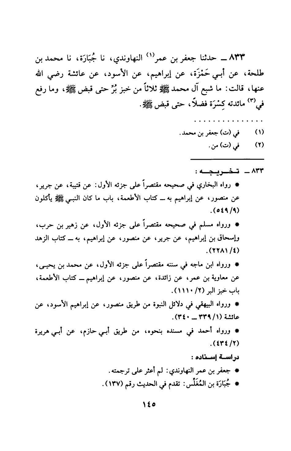 833 - حَدَّثَنَا جَعْفَرُ بْنُ عُمَرَ النَّهَاوَنْديُّ، نَا جُبَارَةُ، نَا مُحَمَّدُ بْنُ طَلْحَةَ، عَنْ أَبِي حَمْزَةَ، عَنْ إِبْرَاهِيمَ، عَنِ الْأَسْوَدِ، عَنْ عَائِشَةَ، رَضِيَ اللَّهُ عَنْهَا، قَالَتْ: §مَا شَبِعَ آلُ مُحَمَّدٍ صَلَّى اللهُ عَلَيْهِ وَسَلَّمَ ثَلَاثًا، مِنْ خُبْزِ بُرٍّ حَتَّى قُبِضَ صَلَّى اللهُ عَلَيْهِ وَسَلَّمَ، وَمَا رُفِعَ فِي مَائِدَتِهِ كِسْرَةٌ فَضْلًا، حَتَّى قُبِضَ صَلَّى اللهُ عَلَيْهِ وَسَلَّمَ