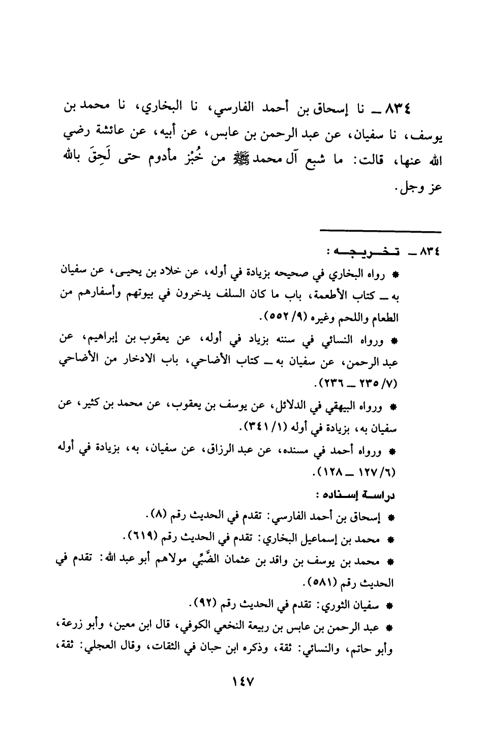 834 - حَدَّثَنَا إِسْحَاقُ بْنُ أَحْمَدَ الْفَارِسِيُّ، نَا الْبُخَارِيُّ، نَا مُحَمَّدُ بْنُ يُوسُفَ، نَا سُفْيَانُ، عَنِ عَبْدِ الرَّحْمَنِ بْنِ عابسٍ، عَنْ أَبِيهِ، عَنْ عَائِشَةَ، رَضِيَ اللَّهُ عَنْهَا، قَالَتْ: §مَا شَبِعَ آلُ مُحَمَّدٍ صَلَّى اللهُ عَلَيْهِ وَسَلَّمَ مِنْ خُبْزٍ مَأْدُومٍ حَتَّى لَحِقَ بِاللَّهِ عَزَّ وَجَلَّ