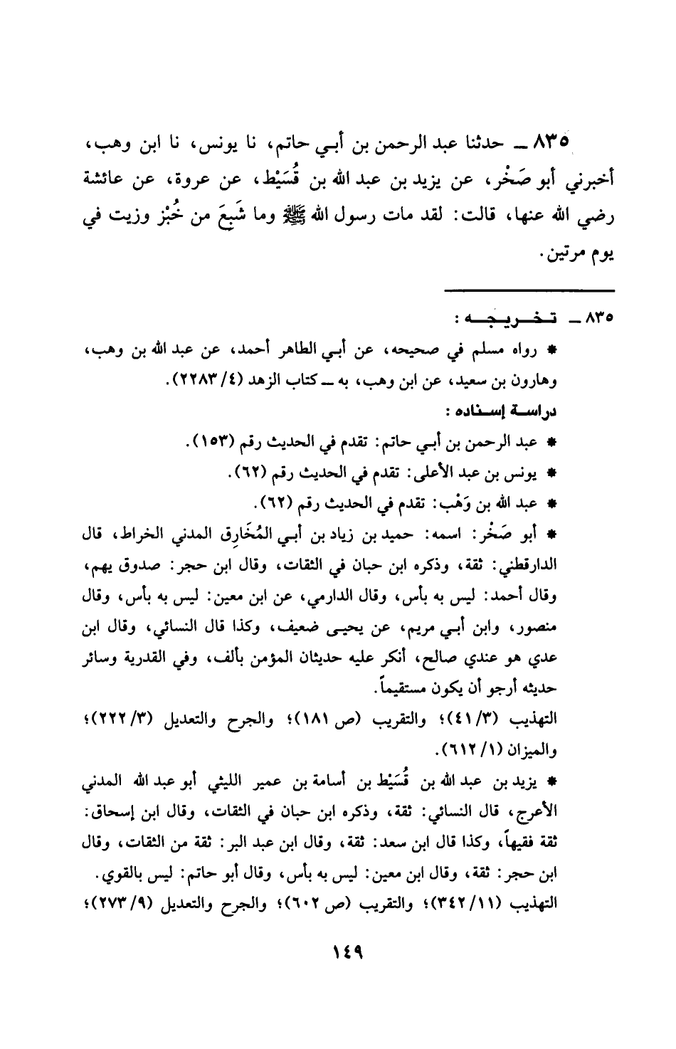 835 - حَدَّثَنَا عَبْدُ الرَّحْمَنِ بْنُ أَبِي حَاتِمٍ، نَا يُونُسُ، نَا ابْنُ وَهْبٍ، أَخْبَرَنِي أَبُو صَخْرٍ، عَنْ يَزِيدَ بْنِ عَبْدِ اللَّهِ بْنِ قُسَيْطٍ، عَنْ عُرْوَةَ، عَنْ عَائِشَةَ، رَضِيَ اللَّهُ عَنْهَا، قَالَتْ: لَقَدْ §مَاتَ رَسُولُ اللَّهِ صَلَّى اللهُ عَلَيْهِ وَسَلَّمَ، وَمَا شَبِعَ مِنْ خُبْزٍ وَزَيْتٍ، فِي يَوْمٍ مَرَّتَيْنِ
