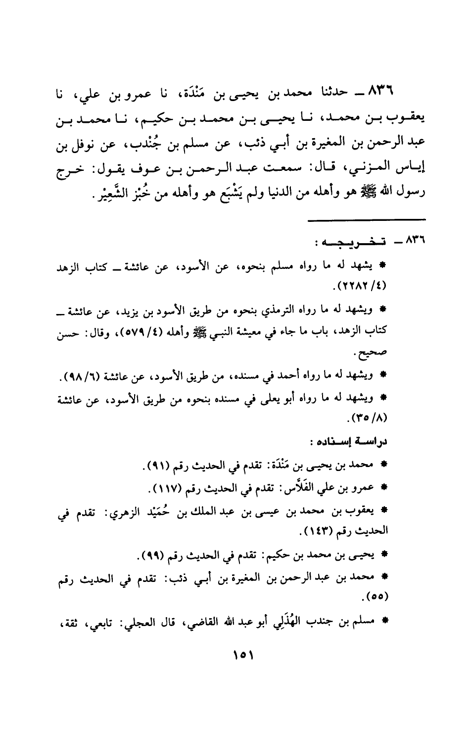 836 - حَدَّثَنَا مُحَمَّدُ بْنُ يَحْيَى بْنِ مَنْدَهْ، نَا عَمْرُو بْنُ عَلِيٍّ، نَا يَعْقُوبُ بْنُ مُحَمَّدٍ، نَا يَحْيَى بْنُ مُحَمَّدِ بْنِ حَكِيمٍ، نَا مُحَمَّدُ بْنُ عَبْدِ الرَّحْمَنِ بْنِ الْمُغِيرَةِ بْنِ أَبِي ذِئْبٍ، عَنْ مُسْلِمِ بْنِ جُنْدُبٍ، عَنْ نَوْفَلِ بْنِ إِيَاسَ الْمُزَنِيِّ، قَالَ: سَمِعْتُ عَبْدَ الرَّحْمَنِ بْنَ عَوْفٍ، يَقُولُ: §خَرَجَ رَسُولُ اللَّهِ صَلَّى اللهُ عَلَيْهِ وَسَلَّمَ هُوَ وَأَهْلُهُ مِنَ الدُّنْيَا، وَلَمْ يَشْبَعْ هُوَ وَأَهْلُهُ مِنْ خُبْزِ شَعِيرٍ