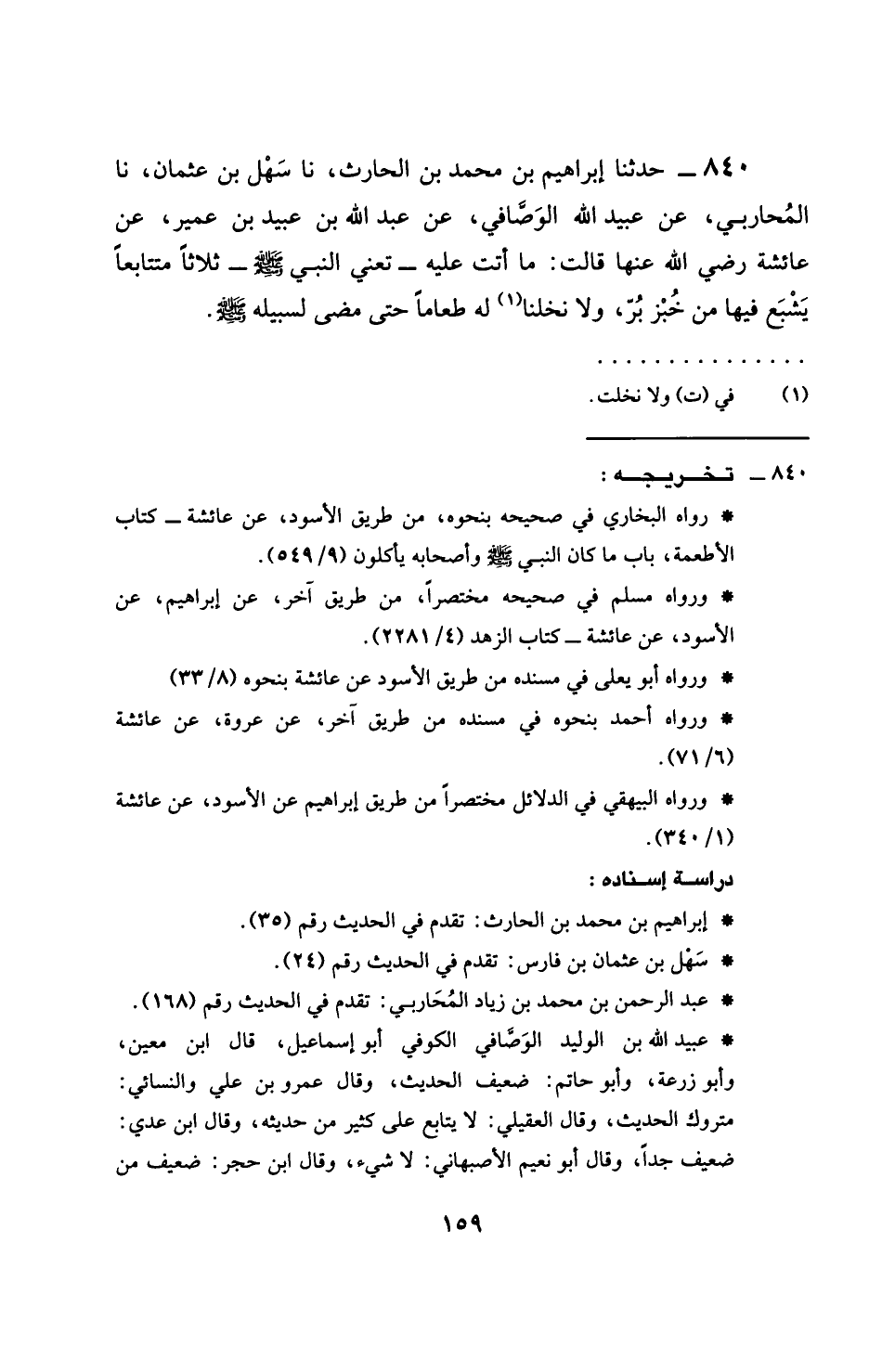 840 - حَدَّثَنَا إِبْرَاهِيمُ بْنُ مُحَمَّدِ بْنِ الْحَارِثِ، نَا سَهْلُ بْنُ عُثْمَانَ، نَا الْمُحَارِبِيُّ، عَنْ عُبَيْدِ اللَّهِ الْوَصَّافِيِّ، عَنْ عَبْدِ اللَّهِ بْنِ عُبَيْدِ بْنِ عُمَيْرٍ، عَنْ عَائِشَةَ، رَضِيَ اللَّهُ عَنْهَا، قَالَتْ: §مَا أَتَتْ عَلَيْهِ، تَعْنِي النَّبِيَّ صَلَّى اللهُ عَلَيْهِ وَسَلَّمَ، ثَلَاثًا مُتَتَابِعًا، يَشْبَعُ فِيهَا مِنْ خُبْزِ بُرٍّ، وَلَا نَخَلْنَا لَهُ طَعَامًا حَتَّى مَضَى لِسَبِيلِهِ صَلَّى اللهُ عَلَيْهِ وَسَلَّمَ