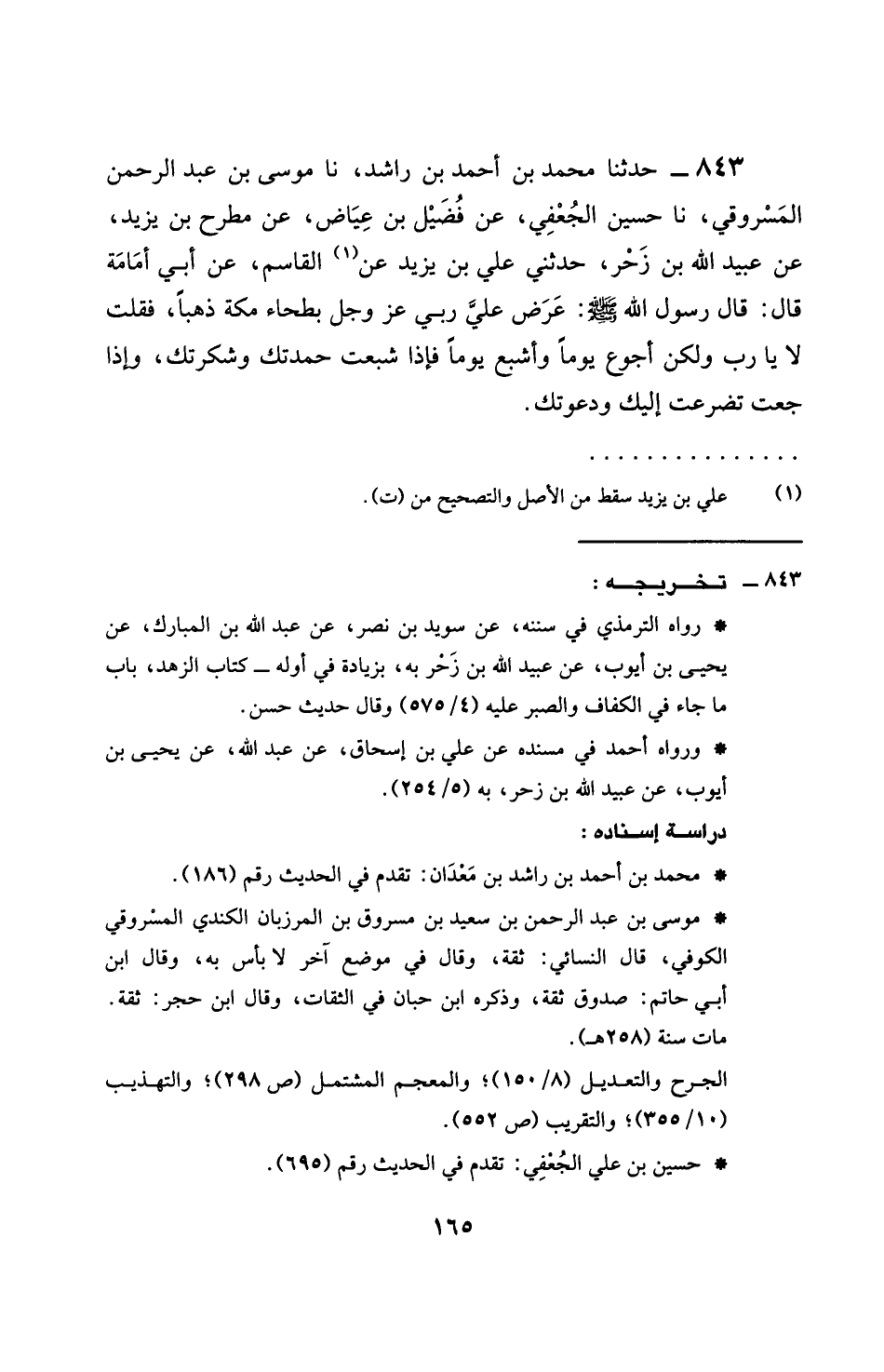 843 - حَدَّثَنَا مُحَمَّدُ بْنُ أَحْمَدَ بْنِ رَاشِدٍ، نَا مُوسَى بْنُ عَبْدِ الرَّحْمَنِ الْمَسْرُوقِيُّ، نَا حُسَيْنٌ الْجُعْفِيُّ، عَنْ فُضَيْلِ بْنِ عِيَاضٍ، عَنْ مُطَّرِحِ بْنِ يَزِيدَ، عَنْ عُبَيْدِ اللَّهِ بْنِ زَحْرٍ، عَنِ الْقَاسِمِ، عَنْ أَبِي أُمَامَةَ، قَالَ: قَالَ رَسُولُ اللَّهِ صَلَّى اللهُ عَلَيْهِ وَسَلَّمَ: §عَرَضَ عَلَيَّ رَبِّي عَزَّ وَجَلَّ بَطْحَاءَ مَكَّةَ ذَهَبًا، فَقُلْتُ: لَا يَا رَبِّ، وَلَكِنْ أَجُوعُ يَوْمًا، وَأَشْبَعُ يَوْمًا، فَإِذَا شَبِعْتُ حَمِدْتُكَ، وَشَكَرْتُكَ، وَإِذَا جُعْتُ تَضَرَّعْتُ إِلَيْكَ وَدَعَوْتُكَ.