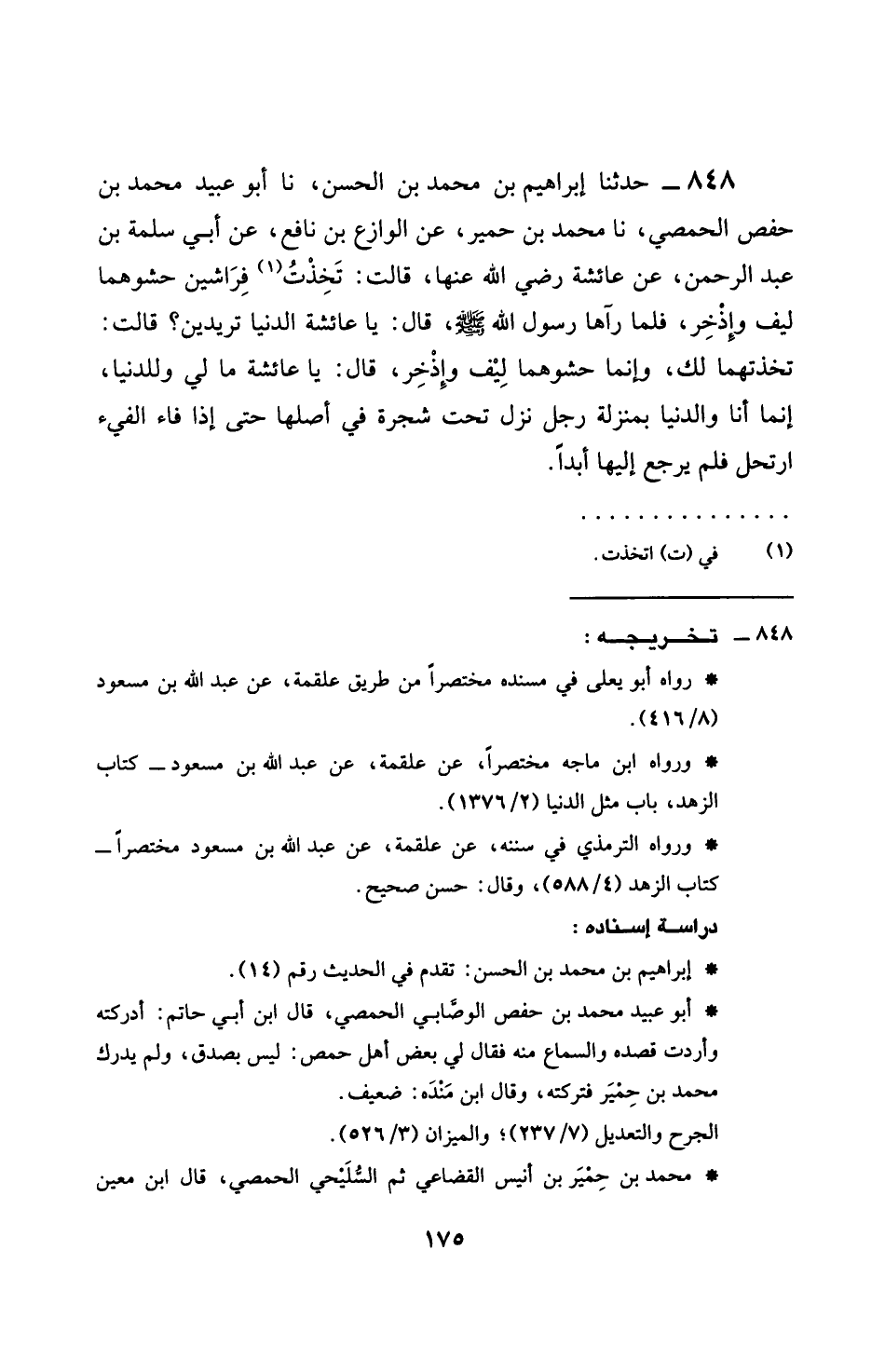 848 - حَدَّثَنَا إِبْرَاهِيمُ بْنُ مُحَمَّدِ بْنِ الْحَسَنِ، نَا أَبُو عُبَيْدٍ مُحَمَّدُ بْنُ حَفْصٍ الْحِمْصِيُّ، نَا مُحَمَّدُ بْنُ حُمَيْدٍ، عَنِ الْوَازِعِ بْنِ نَافِعٍ، عَنْ أَبِي سَلَمَةَ بْنِ عَبْدِ الرَّحْمَنِ، عَنْ عَائِشَةَ، رَضِيَ اللَّهُ عَنْهَا، قَالَتِ: اتَخِذْتُ فِرَاشَيْنِ حَشْوَهُمَا لِيفٌ وَإِذْخَرٌ، فَلَمَّا رَآهُمَا رَسُولُ اللَّهِ صَلَّى اللهُ عَلَيْهِ وَسَلَّمَ قَالَ: يَا عَائِشَةُ، الدُّنْيَا تُرِيدِينَ؟ قَالَتِ: اتَخِذْتُهُمَا لَكَ، وَإِنَّمَا حَشْوُهُمَا لِيفٌ وَإِذْخَرٌ، فَقَالَ: يَا عَائِشَةُ، §مَالِي وَلِلدُّنْيَا؟ إِنَّمَا أَنَا وَالدُّنْيَا بِمَنْزِلَةِ رَجُلٍ نَزَلَ تَحْتَ شَجَرَةٍ فِي أَصْلِهَا، حَتَّى إِذَا فَاءَ الْفَيْءُ ارْتَحَلَ فَلَمْ يَرْجِعْ إِلَيْهَا أَبَدًا