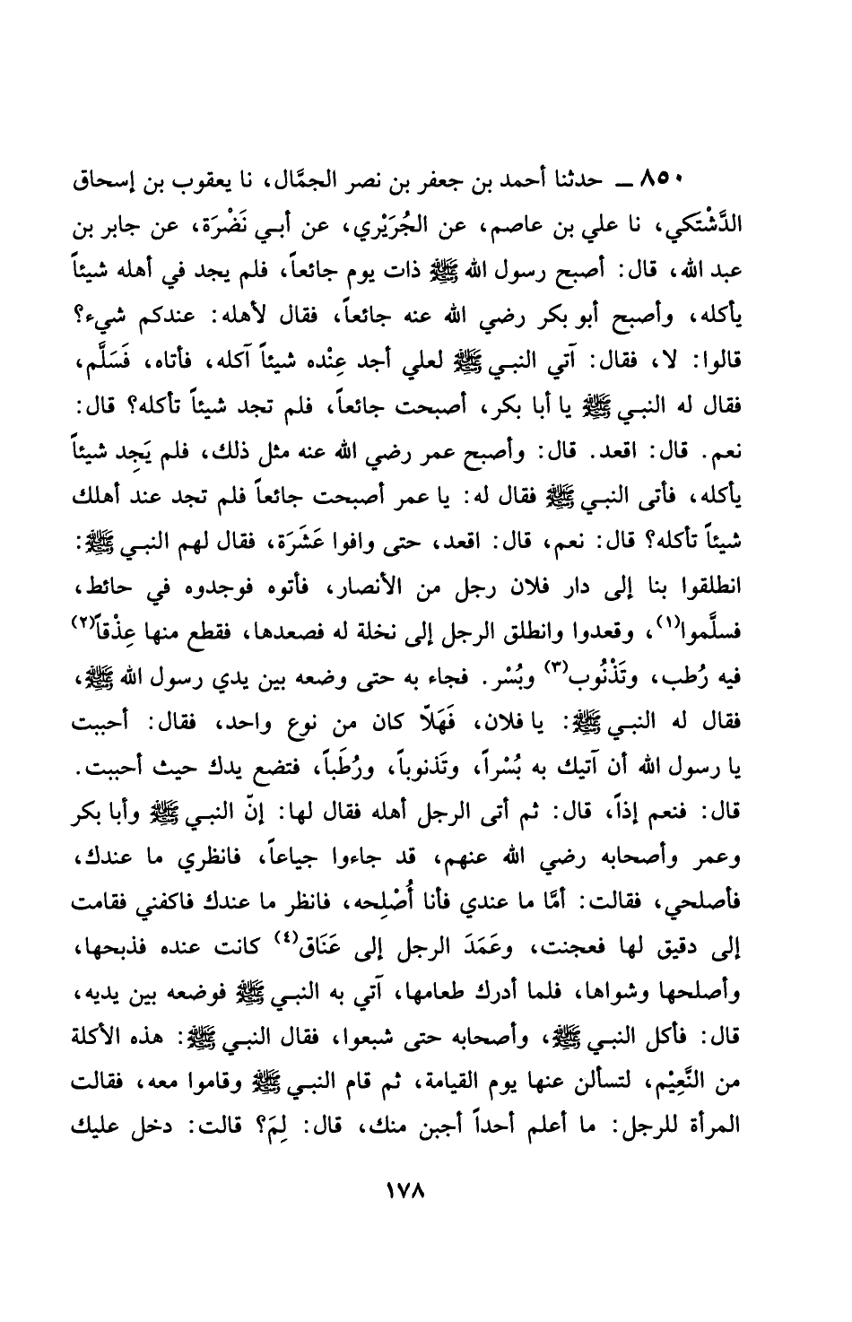 850 - حَدَّثَنَا أَحْمَدُ بْنُ جَعْفَرِ بْنِ نَصْرٍ الْجَمَّالُ، نَا يَعْقُوبُ بْنُ إِسْحَاقَ الدَّشْتَكِيُّ، نَا عَلِيُّ بْنُ عَاصِمٍ، عَنِ الْجُرَيْرِيِّ، عَنْ أَبِي نَضْرَةَ، عَنْ جَابِرِ بْنِ عَبْدِ اللَّهِ، قَالَ: §أَصْبَحَ رَسُولُ اللَّهِ صَلَّى اللهُ عَلَيْهِ وَسَلَّمَ ذَاتَ يَوْمٍ جَائِعًا، فَلَمْ يَجِدْ فِي أَهْلِهِ شَيْئًا يَأْكُلُهُ، وَأَصْبَحَ أَبُو بَكْرٍ رَضِيَ اللَّهُ عَنْهُ جَائِعًا، فَقَالَ لِأَهْلِهِ: عِنْدَكُمْ شَيْءٌ؟ قَالُوا: لَا، فَقَالَ: آتِي النَّبِيَّ صَلَّى اللهُ عَلَيْهِ وَسَلَّمَ، لَعَلِّي أَجِدُ عِنْدَهُ شَيْئًا آكُلُهُ، فَأَتَاهُ فَسَلَّمَ، فَقَالَ لَهُ النَّبِيُّ صَلَّى اللهُ عَلَيْهِ وَسَلَّمَ: يَا أَبَا بَكْرٍ، أَصْبَحْتَ جَائِعًا، فَلَمْ تَجِدْ شَيْئًا تَأْكُلُهُ؟ قَالَ: نَعَمْ، قَالَ: اقْعُدْ قَالَ: وَأَصْبَحَ عُمَرُ رَضِيَ اللَّهُ عَنْهُ مِثْلَ ذَلِكَ، فَلَمْ يَجِدْ عِنْدَ أَهْلِهِ شَيْئًا يَأْكُلُهُ، فَأَتَى النَّبِيَّ صَلَّى اللهُ عَلَيْهِ وَسَلَّمَ، فَقَالَ لَهُ: يَا عُمَرُ، أَصْبَحْتَ جَائِعًا فَلَمْ تَجِدْ عِنْدَ أَهْلِكَ شَيْئًا تَأْكُلُهُ؟ قَالَ: نَعَمْ، قَالَ: اقْعُدْ، حَتَّى وَافَوْا عَشَرَةً، فَقَالَ لَهُمُ النَّبِيُّ صَلَّى اللهُ عَلَيْهِ وَسَلَّمَ: انْطَلِقُوا بِنَا إِلَى دَارِ فُلَانٍ مِنَ الْأَنْصَارِ، فَأَتَوْهُ، فَوَجَدُوهُ فِي حَائِطٍ، فَسَلَّمُوا، وَقَعَدُوا، وَانْطَلَقَ الرَّجُلُ إِلَى نَخْلَةٍ لَهُ فَصَعَدَهَا فَقَطَعَ مِنْهَا عَذَقًا فِيهِ رُطَبٌ، وَتَذْنُوبٌ وَبُسْرٌ، فَجَاءَ بِهِ حَتَّى وَضَعَهُ بَيْنَ يَدَيْ رَسُولُ اللَّهِ صَلَّى اللهُ عَلَيْهِ وَسَلَّمَ، فَقَالَ لَهُ النَّبِيُّ صَلَّى اللهُ عَلَيْهِ وَسَلَّمَ: فَهَلَّا كَانَ مِنْ نَوْعٍ وَاحِدٍ؟ فَقَالَ: أَحْبَبْتُ يَا رَسُولَ اللَّهِ أَنْ آتِيَكَ بِهِ بُسْرًا، وَتَذْنُوبًا، وَرُطَبًا، فَتَضَعُ يَدَكَ حَيْثُ أَحْبَبْتَ، قَالَ: فَنَعَمْ إِذًا. قَالَ: ثُمَّ أَتَى الرَّجُلُ أَهْلَهُ، فَقَالَ لَهَا: إِنَّ النَّبِيَّ صَلَّى اللهُ عَلَيْهِ وَسَلَّمَ وَأَبَا بَكْرٍ وَعُمَرَ وَأَصْحَابَهُ رَضِيَ اللَّهُ عَنْهُمْ قَدْ جَاءُوا جِيَاعًا، فَانْظُرِي مَا عِنْدَكَ، فَأَصْلِحِي، فَقَالَتْ: أَمَّا مَا عِنْدِي فَأَنَا أُصْلِحُهُ، فَانْظُرْ مَا عِنْدَكَ فَاكْفِنِي، فَقَامَتْ إِلَى دَقِيقٍ لَهَا فَعَجَنَتْ، وَعَمَدَ الرَّجُلُ إِلَى عَنَاقٍ كَانَتْ عِنْدَهُ، فَذَبَحَهَا، وَأَصْلَحَهَا، وَشَوَاهَا، فَلَمَّا أَدْرَكَ طَعَامَهَا، أَتَى بِهِ النَّبِيَّ صَلَّى اللهُ عَلَيْهِ وَسَلَّمَ، فَوَضَعَهُ بَيْنَ يَدَيْهِ قَالَ: فَأَكَلَ النَّبِيُّ صَلَّى اللهُ عَلَيْهِ وَسَلَّمَ، وَأَصْحَابُهُ حَتَّى شَبِعُوا، فَقَالَ النَّبِيُّ صَلَّى اللهُ عَلَيْهِ وَسَلَّمَ: هَذِهِ الْأَكْلَةُ مِنَ النَّعِيمِ، لَتُسْأَلُنَّ عَنْهَا يَوْمَ الْقِيَامَةِ، ثُمَّ قَامَ النَّبِيُّ صَلَّى اللهُ عَلَيْهِ وَسَلَّمَ، وَقَامُوا مَعَهُ، فَقَالَتِ الْمَرْأَةُ لِلرَّجُلِ: مَا أَعْلَمُ أَحَدًا أَجْبَنَ مِنْكَ، قَالَ: لِمَ؟ قَالَتْ: دَخَلَ عَلَيْكَ -[179]- رَسُولُ اللَّهِ صَلَّى اللهُ عَلَيْهِ وَسَلَّمَ مَنْزِلَكَ، ثُمَّ خَرَجَ، لَمْ يَدْعُ لَكَ بِخَيْرٍ؟ فَتَبِعَهُ، فَقَامَ رَسُولُ اللَّهِ صَلَّى اللهُ عَلَيْهِ وَسَلَّمَ، وَقَالَ: مَا شَأْنُكَ؟ قَالَ: قَالَتْ لِيَ الْمَرْأَةُ كَذَا، فَقَالَ النَّبِيُّ صَلَّى اللهُ عَلَيْهِ وَسَلَّمَ: أَلَا أُرَاهَا أَكْيَسَ مِنْكَ؟ قَالَ: فَرَجَعَ النَّبِيُّ صَلَّى اللهُ عَلَيْهِ وَسَلَّمَ وَدَعَا لَهُمْ بِخَيْرٍ