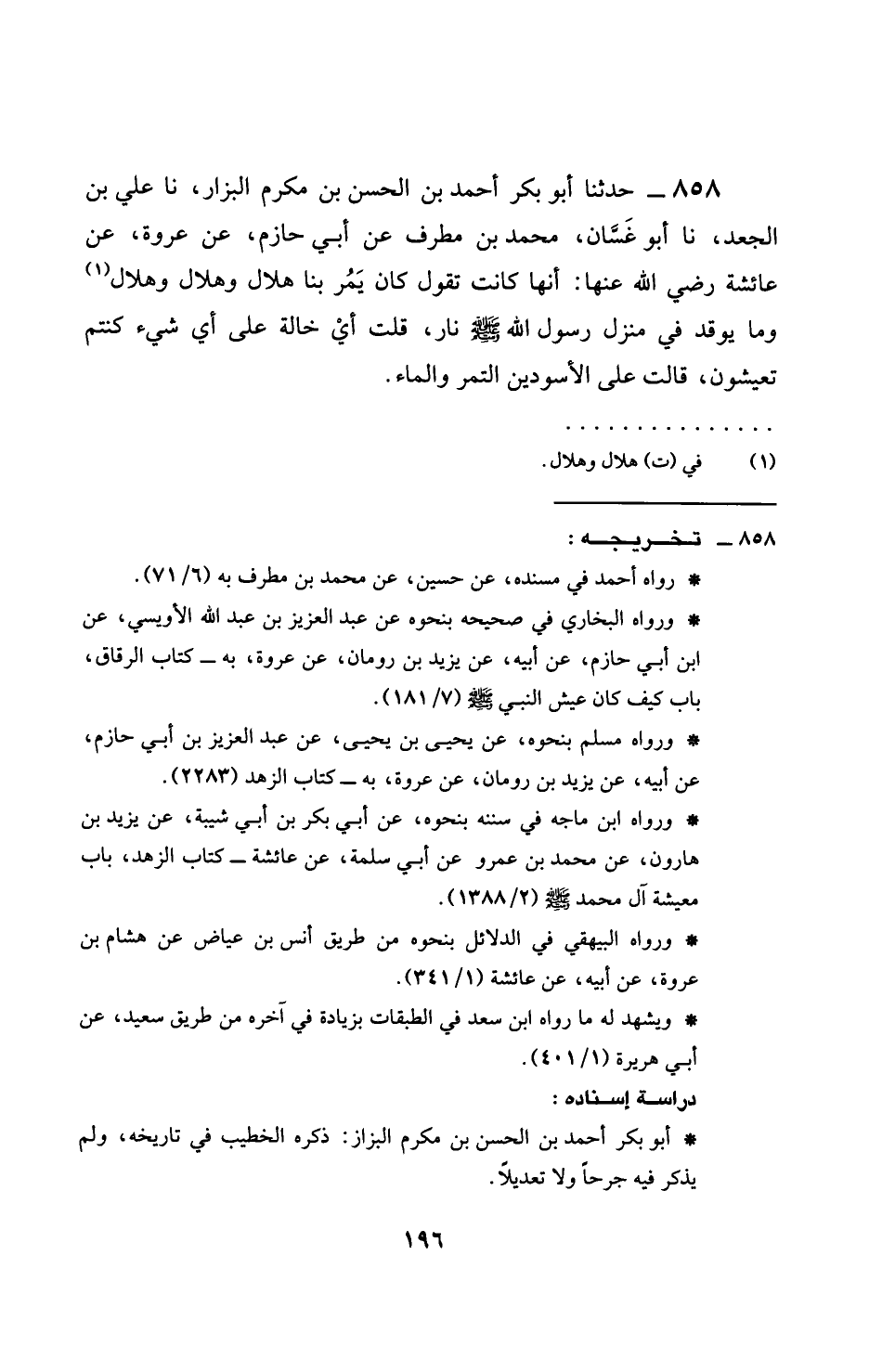 858 - حَدَّثَنَا أَبُو بَكْرٍ أَحْمَدُ بْنُ الْحَسَنِ بْنِ مُكْرَمٍ الْبَزَّازُ، نَا عَلِيُّ بْنُ الْجَعْدِ، نَا أَبُو غَسَّانَ مُحَمَّدُ بْنُ مُطَرِّفٍ، عَنْ أَبِي حَازِمٍ، عَنْ عُرْوَةَ، عَنْ عَائِشَةَ، رَضِيَ اللَّهُ عَنْهَا: أَنَّهَا كَانَتْ تَقُولُ: كَانَ §يَمُرُّ بِنَا هِلَالٌ وَهِلَالٌ وَهِلَالٌ، وَمَا يُوقَدُ فِي مَنْزِلِ رَسُولِ اللَّهِ صَلَّى اللهُ عَلَيْهِ وَسَلَّمَ نَارٌ، قُلْتُ: أَيْ خَالَةُ، عَلَى أَيِّ شَيْءٍ كُنْتُمْ تَعِيشُونَ؟ قَالَتْ: عَلَى الْأَسْوَدَيْنِ التَّمْرِ وَالْمَاءِ.