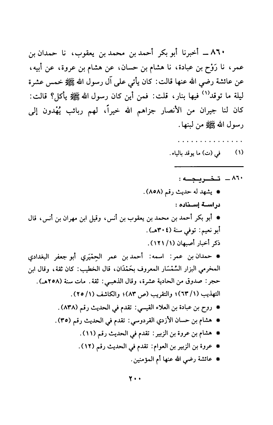 860 - أَخْبَرَنَا أَبُو بَكْرٍ أَحْمَدُ بْنُ مُحَمَّدِ بْنِ يَعْقُوبَ، نَا حَمْدَانُ بْنُ عُمَرَ، نَا رَوْحُ بْنُ عُبَادَةَ، نَا هِشَامُ بْنُ حَسَّانَ، عَنْ هِشَامِ بْنِ عُرْوَةَ، عَنْ أَبِيهِ، عَنْ عَائِشَةَ، رَضِيَ اللَّهُ عَنْهَا، قَالَتْ: كَانَ §يَأْتِي عَلَى آلِ رَسُولِ اللَّهِ صَلَّى اللهُ عَلَيْهِ وَسَلَّمَ خَمْسَ عَشْرَةَ لَيْلَةً مَا تُوقَدُ فِيهَا بِنَارٍ، قُلْتُ: فَمِنْ أَيْنَ كَانَ رَسُولُ اللَّهِ صَلَّى اللهُ عَلَيْهِ وَسَلَّمَ يَأْكُلُ؟ قَالَتْ: كَانَ لَنَا جِيرَانٌ مِنَ الْأَنْصَارِ جَزَاهُمُ اللَّهُ خَيْرًا، لَهُمْ رَبَائِبُ، يُهْدُونَ إِلَى رَسُولِ اللَّهِ صَلَّى اللهُ عَلَيْهِ وَسَلَّمَ مِنْ لَبَنِهَا