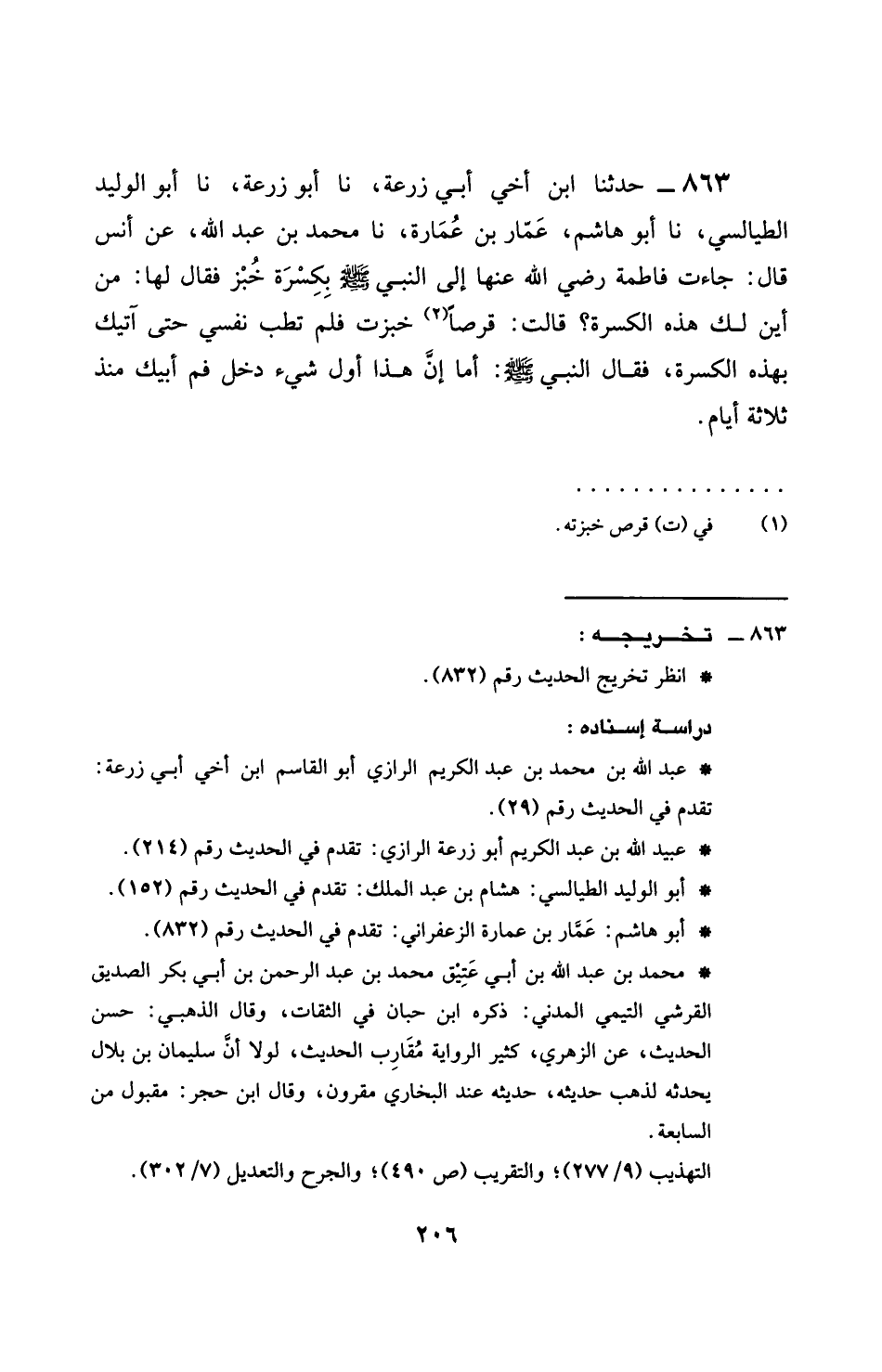 863 - حَدَّثَنَا ابْنُ أَخِي أَبِي زُرْعَةَ، نَا أَبُو زَرْعَةَ، نَا أَبُو الْوَلِيدِ الطَّيَالِسِيُّ، نَا أَبُو هَاشِمٍ عَمَّارُ بْنُ عُمَارَةَ، نَا مُحَمَّدُ بْنُ عَبْدِ اللَّهِ، عَنْ أَنَسٍ، قَالَ: §جَاءَتْ فَاطِمَةُ رَضِيَ اللَّهُ عَنْهَا إِلَى النَّبِيِّ صَلَّى اللهُ عَلَيْهِ وَسَلَّمَ بِكِسْرَةِ خُبْزٍ، فَقَالَ لَهَا: مِنْ أَيْنَ لَكِ هَذِهِ الْكِسْرَةُ؟ قَالَتْ: قُرْصًا خَبَزْتُ، فَلَمْ تَطِبْ نَفْسِي حَتَّى آتِيَكَ بِهَذِهِ الْكِسْرَةِ، فَقَالَ النَّبِيُّ صَلَّى اللهُ عَلَيْهِ وَسَلَّمَ: أَمَا إِنَّ هَذَا أَوَّلُ شَيْءٍ دَخَلَ فَمَ أَبِيكِ مُنْذُ ثَلَاثَةِ أَيَّامٍ