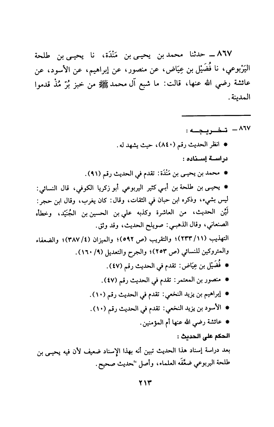 867 - حَدَّثَنَا مُحَمَّدُ بْنُ يَحْيَى بْنِ مَنْدَهْ، نَا يَحْيَى بْنُ طَلْحَةَ الْيَرْبُوعِيُّ، نَا فُضَيْلُ بْنُ عِيَاضٍ، عَنْ مَنْصُورٍ، عَنْ إِبْرَاهِيمَ، عَنِ الْأَسْوَدِ، عَنْ عَائِشَةَ، رَضِيَ اللَّهُ عَنْهَا، قَالَتْ: §مَا شَبِعَ آلُ مُحَمَّدٍ صَلَّى اللهُ عَلَيْهِ وَسَلَّمَ مِنْ خُبْزِ بُرٍّ مُذْ قَدِمُوا الْمَدِينَةَ