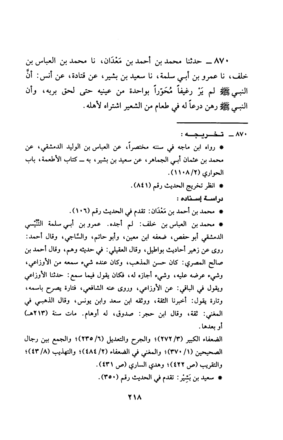 870 - حَدَّثَنَا مُحَمَّدُ بْنُ أَحْمَدَ بْنِ مَعْدَانَ، نَا مُحَمَّدُ بْنُ الْعَبَّاسِ بْنِ خَلَفٍ، نَا عَمْرُو بْنُ أَبِي سَلَمَةَ، نَا سَعِيدُ بْنُ بَشِيرٍ، عَنْ قَتَادَةَ، عَنْ أَنَسٍ، أَنَّ النَّبِيَّ صَلَّى اللهُ عَلَيْهِ وَسَلَّمَ §لَمْ يَرَ رَغِيفًا مُحَوَّرًا بِوَاحِدَةٍ مِنْ عَيْنَيْهِ حَتَّى لَحِقَ بِرَبِّهِ، وَأَنَّ النَّبِيَّ صَلَّى اللهُ عَلَيْهِ وَسَلَّمَ رَهَنَ دِرْعًا لَهُ فِي طَعَامٍ مِنَ الشَّعِيرِ، اشْتَرَاهُ لِأَهْلِهِ