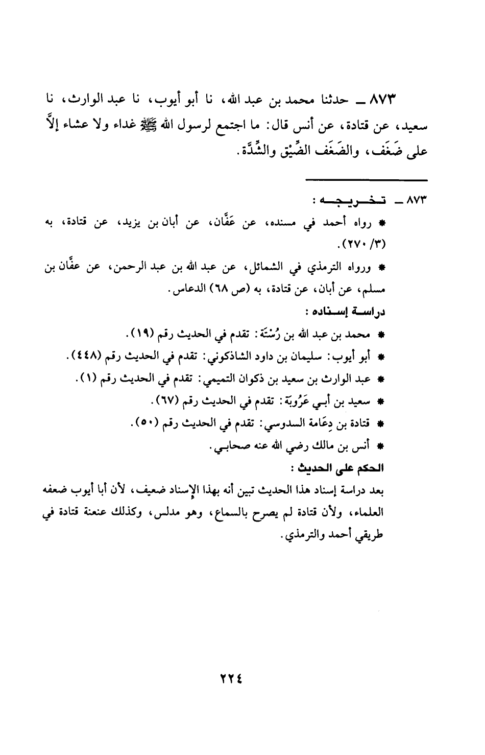 873 - حَدَّثَنَا مُحَمَّدُ بْنُ عَبْدِ اللَّهِ، نَا أَبُو أَيُّوبَ، نَا عَبْدُ الْوَارِثِ، نَا سَعِيدٌ، عَنْ قَتَادَةَ، عَنْ أَنَسٍ، قَالَ: §مَا اجْتَمَعَ لِرَسُولُ اللَّهِ صَلَّى اللهُ عَلَيْهِ وَسَلَّمَ غَدَاءٌ وَلَا عِشَاءٌ إِلَّا عَلَى ضَفَفٍ. الضَّفَفُ: الضِّيقُ وَالشِّدَّةُ