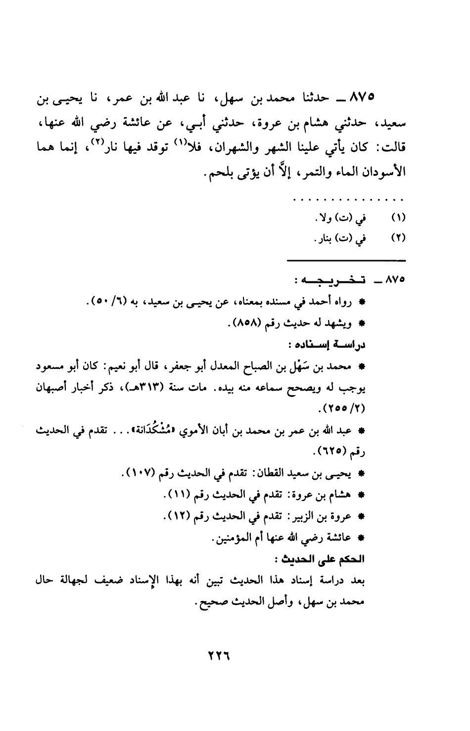 875 - حَدَّثَنَا مُحَمَّدُ بْنُ سَهْلٍ، نَا عَبْدُ اللَّهِ بْنُ عُمَرَ، نَا يَحْيَى بْنُ سَعِيدٍ، حَدَّثَنِي هِشَامُ بْنُ عُرْوَةَ، حَدَّثَنِي أَبِي، عَنْ عَائِشَةَ، رَضِيَ اللَّهُ عَنْهَا، قَالَتْ: كَانَ §يَأْتِي عَلَيْنَا الشَّهْرُ، وَالشَّهْرَانُ، فَلَا نُوقِدُ فِيهِمَا نَارًا، إِنَّمَا هُمَا الْأَسْوَدَانِ الْمَاءُ وَالتَّمْرُ، إِلَّا أَنْ يُؤْتَى بِلَحْمٍ