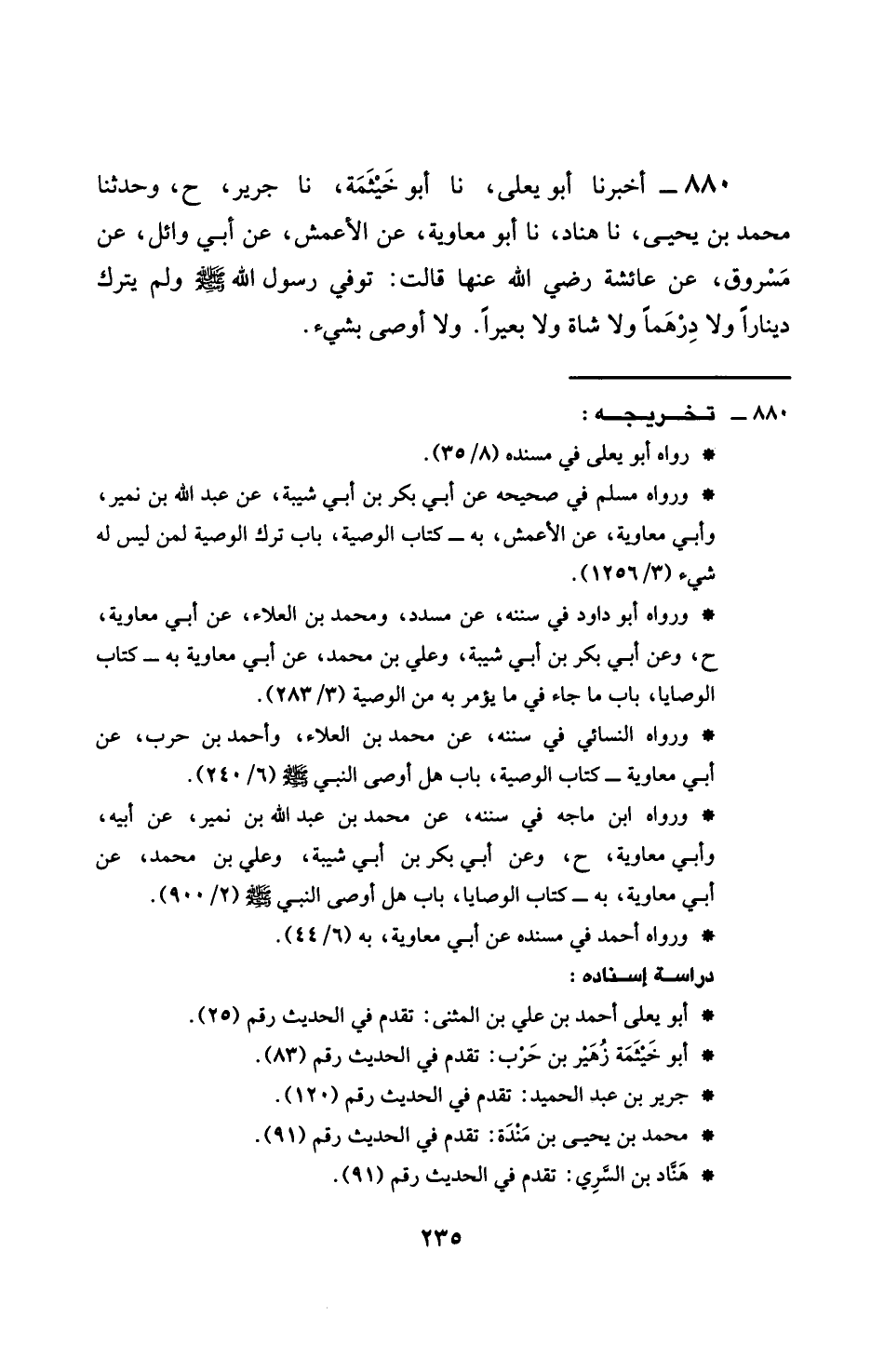 880 - أَخْبَرَنَا أَبُو يَعْلَى، نَا أَبُو خَيْثَمَةَ، نَا جَرِيرٌ. ح. وَحَدَّثَنَا مُحَمَّدُ بْنُ يَحْيَى، نَا هَنَّادٌ، نَا أَبُو مُعَاوِيَةَ، عَنِ الْأَعْمَشِ، عَنْ أَبِي وَائِلٍ، عَنْ مَسْرُوقٍ، عَنْ عَائِشَةَ، رَضِيَ اللَّهُ عَنْهَا، قَالَتْ: §تُوُفِّيَ رَسُولُ اللَّهِ صَلَّى اللهُ عَلَيْهِ وَسَلَّمَ وَلَمْ يَتْرُكْ دِينَارًا، وَلَا دِرْهَمًا، وَلَا شَاةً، وَلَا بَعِيرًا، وَلَا أَوْصَى بِشَيْءٍ