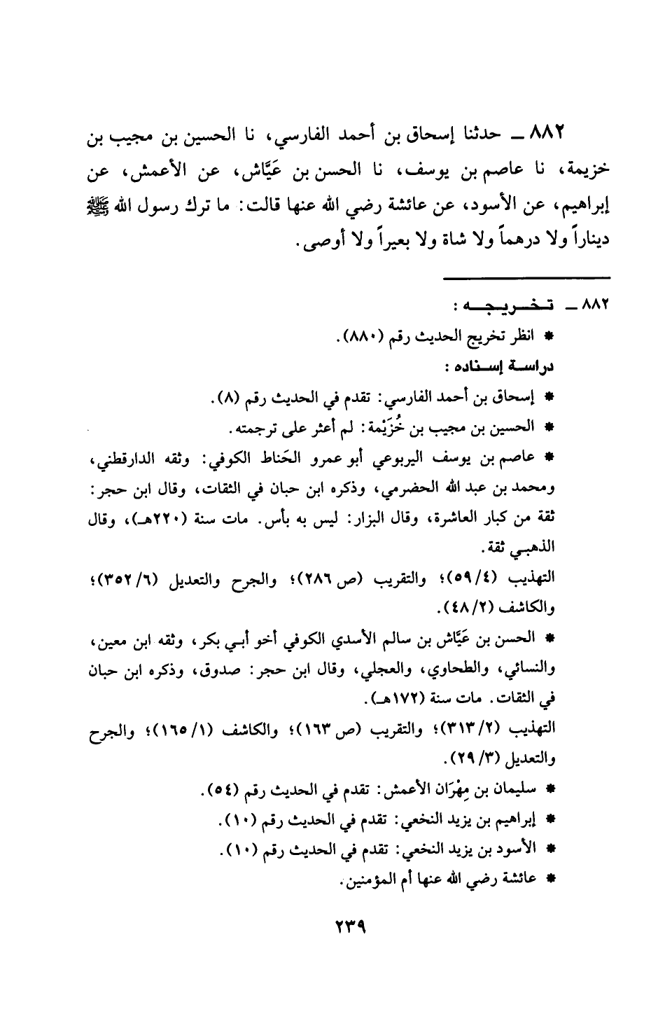 882 - حَدَّثَنَا إِسْحَاقُ بْنُ أَحْمَدَ الْفَارِسِيُّ، نَا الْحُسَيْنُ بْنُ مُجِيبِ بْنِ خُزَيْمَةَ، نَا عَاصِمُ بْنُ يُوسُفَ، نَا الْحَسَنُ بْنُ عَيَّاشٍ، عَنِ الْأَعْمَشِ، عَنْ إِبْرَاهِيمَ، عَنِ الْأَسْوَدِ، عَنْ عَائِشَةَ، رَضِيَ اللَّهُ عَنْهَا، قَالَتْ: §مَا تَرَكَ رَسُولُ اللَّهِ صَلَّى اللهُ عَلَيْهِ وَسَلَّمَ دِينَارًا، وَلَا دِرْهَمًا، وَلَا شَاةً، وَلَا بَعِيرًا، وَلَا أَوْصَى