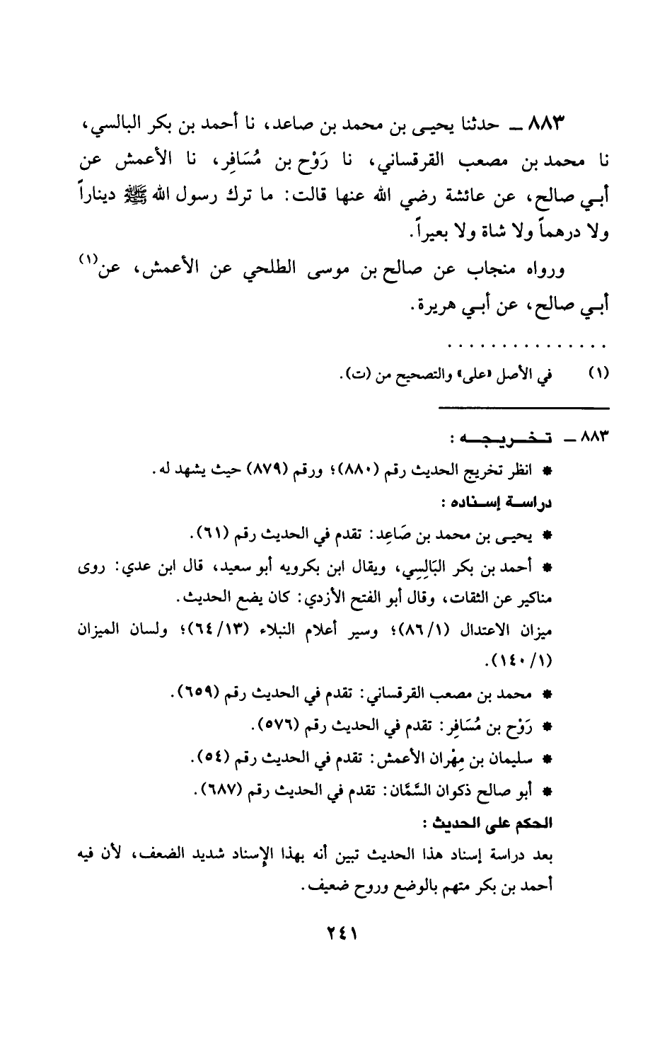 883 - حَدَّثَنَا يَحْيَى بْنُ مُحَمَّدِ بْنِ صَاعِدٍ، نَا أَحْمَدُ بْنُ بَكْرٍ الْبَالِسِيُّ، نَا مُحَمَّدُ بْنُ مُصْعَبٍ الْقُرْقُسَانِيُّ، نَا رَوْحُ بْنُ مُسَافِرٍ، نَا الْأَعْمَشُ، عَنْ أَبِي صَالِحٍ، عَنْ عَائِشَةَ، رَضِيَ اللَّهُ عَنْهَا، قَالَتْ: §مَا تَرَكَ رَسُولُ اللَّهِ صَلَّى اللهُ عَلَيْهِ وَسَلَّمَ دِينَارًا، وَلَا دِرْهَمًا، وَلَا شَاةً، وَلَا بَعِيرًا وَرَوَاهُ مِنْجَابٌ، عَلَى صَالِحِ بْنِ مُوسَى الطَّلْحِيِّ، عَنِ الْأَعْمَشِ، عَنْ أَبِي صَالِحٍ، عَنْ أَبِي هُرَيْرَةَ