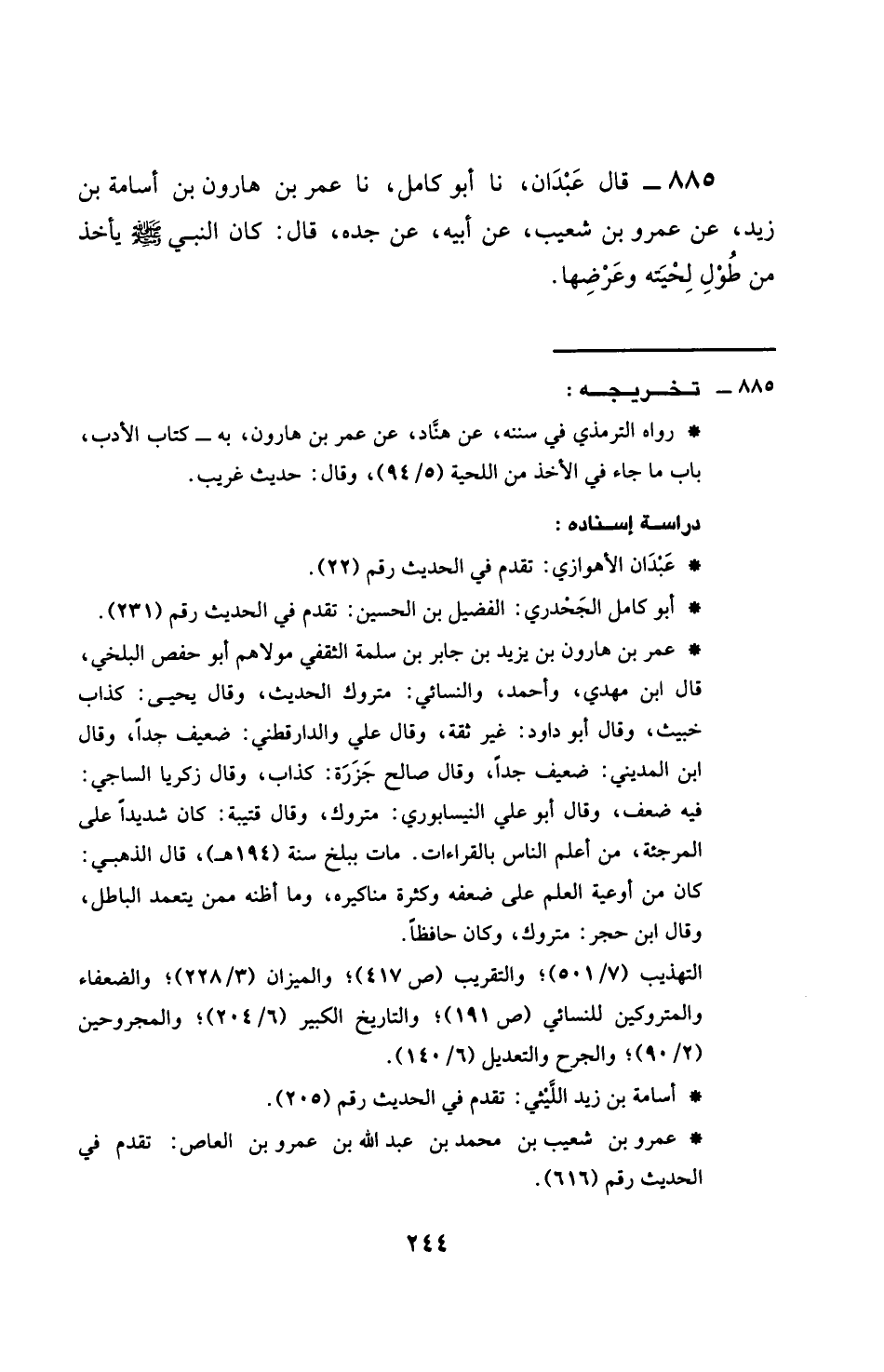 885 - قَالَ عَبْدَانُ: نَا أَبُو كَامِلٍ، نَا عُمَرُ بْنُ هَارُونَ، عَنْ أُسَامَةَ بْنِ زَيْدٍ، عَنْ عَمْرِو بْنِ شُعَيْبٍ، عَنْ أَبِيهِ، عَنْ جَدِّهِ، قَالَ: كَانَ النَّبِيُّ صَلَّى اللهُ عَلَيْهِ وَسَلَّمَ §يَأْخُذُ مِنْ طُولِ لِحْيَتِهِ وَعَرْضِهَا