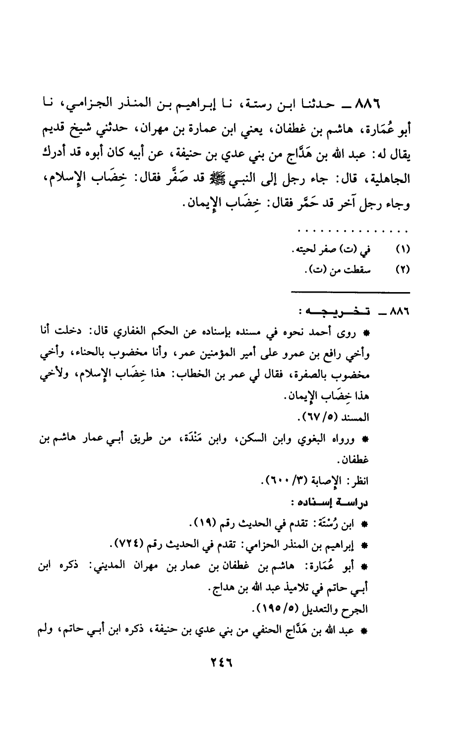 886 - حَدَّثَنَا ابْنُ رُسْتَةُ، نَا إِبْرَاهِيمُ بْنُ الْمُنْذِرِ الْحِزَامِيُّ، نَا أَبُو عُمَارَةَ هَاشِمُ بْنُ غَطَفَانَ يَعْنِي ابْنَ عُمَارَةَ بْنَ مِهْرَانَ، حَدَّثَنِي شَيْخٌ قَدِيمٌ يُقَالُ لَهُ عَبْدُ اللَّهِ بْنُ هَدَّاج، مِنْ بَنِي عَدِيِّ بْنِ حَنِيفَةَ، عَنْ أَبِيهِ، وَكَانَ أَبُوهُ قَدْ أَدْرَكَ الْجَاهِلِيَّةَ، قَالَ: جَاءَ رَجُلٌ إِلَى النَّبِيِّ صَلَّى اللهُ عَلَيْهِ وَسَلَّمَ قَدْ صَفَّرَ، فَقَالَ لَهُ: §خِضَابُ الْإِسْلَامِ، وَجَاءَهُ رَجُلٌ آخَرُ قَدْ حَمَّرَ، فَقَالَ لَهُ: خِضَابُ الْإِيمَانِ