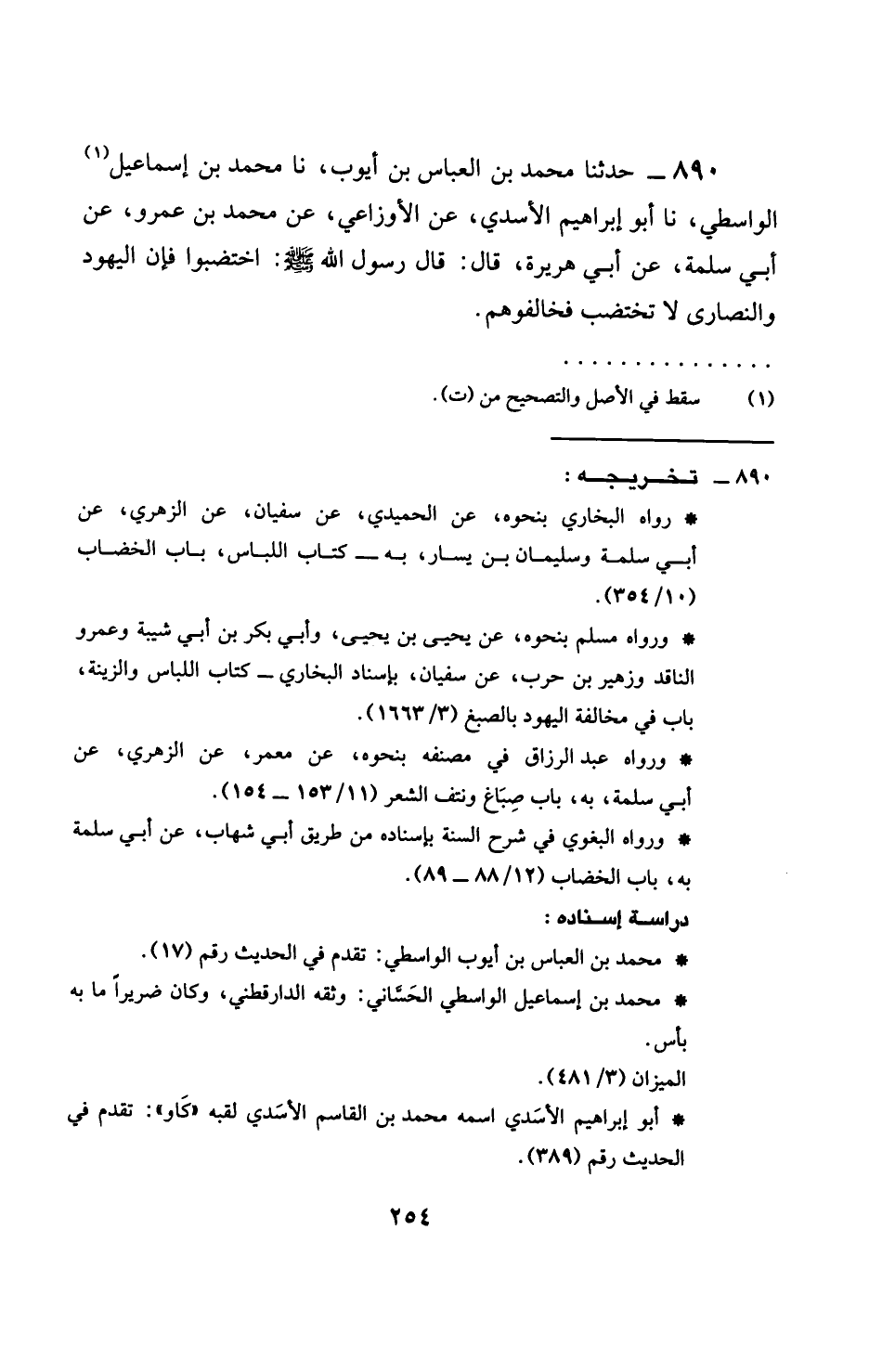 890 - حَدَّثَنَا مُحَمَّدُ بْنُ الْعَبَّاسِ بْنِ أَيُّوبَ، نَا مُحَمَّدُ بْنُ إِسْمَاعِيلَ الْوَاسِطِيُّ، نَا أَبُو إِبْرَاهِيمَ الْأَسَدِيُّ، عَنِ الْأَوْزَاعِيِّ، عَنْ مُحَمَّدِ بْنِ عَمْرٍو، عَنْ أَبِي سَلَمَةَ، عَنْ أَبِي هُرَيْرَةَ، قَالَ: قَالَ رَسُولُ اللَّهِ صَلَّى اللهُ عَلَيْهِ وَسَلَّمَ: §اخْتَضِبُوا، فَإِنَّ الْيَهُودَ وَالَنْصَارىَ لَا تَخْتَضِبُ، فَخَالِفُوهُمْ