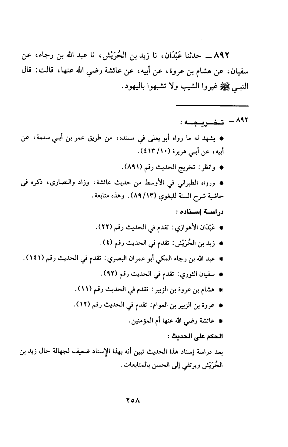 892 - حَدَّثَنَا عَبْدَانُ، نَا زَيْدُ بْنُ الْحَرِيشِ، نَا عَبْدُ اللَّهِ بْنُ رَجَاءٍ، عَنْ سُفْيَانَ، عَنْ هِشَامِ بْنِ عُرْوَةَ، عَنْ أَبِيهِ، عَنْ عَائِشَةَ، رَضِيَ اللَّهُ عَنْهَا، قَالَتْ: قَالَ النَّبِيُّ صَلَّى اللهُ عَلَيْهِ وَسَلَّمَ: §غَيِّرُوا الشَّيْبَ، وَلَا تَشَبَّهُوا بِالْيَهُودِ.