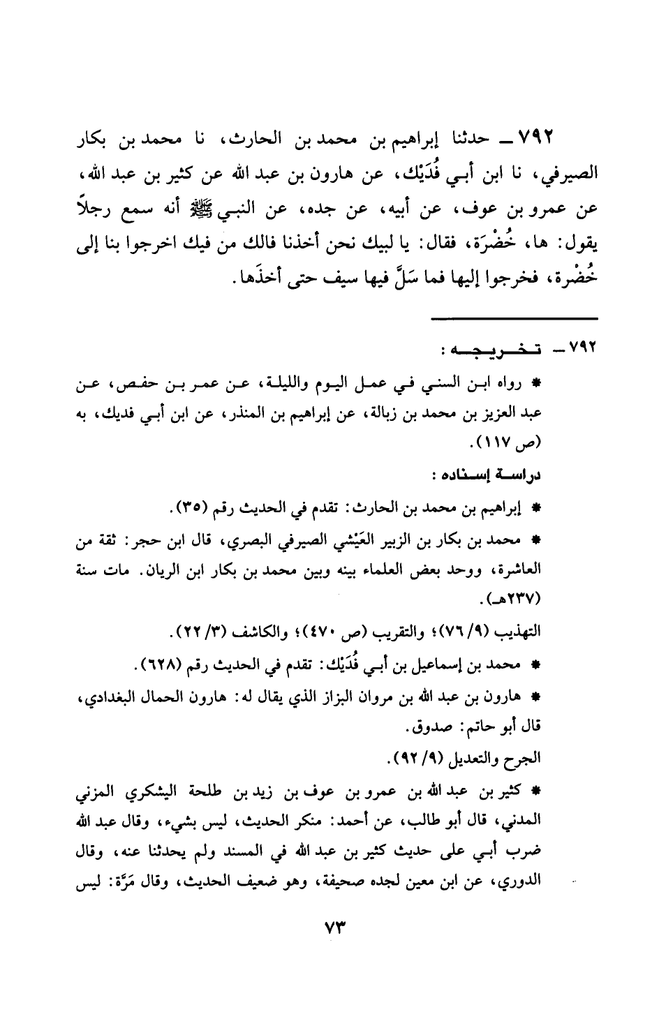 792 - حَدَّثَنَا إِبْرَاهِيمُ بْنُ مُحَمَّدِ بْنِ الْحَارِثِ، نَا مُحَمَّدُ بْنُ بَكَّارٍ الصَّيْرَفِيُّ، نَا ابْنُ أَبِي فُدَيْكٍ، عَنْ هَارُونَ بْنِ عَبْدِ اللَّهِ، عَنْ كَثِيرِ بْنِ عَبْدِ اللَّهِ بْنِ عَمْرِو بْنِ عَوْفٍ، عَنْ أَبِيهِ، عَنْ جَدِّهِ، عَنِ النَّبِيِّ، صَلَّى اللهُ عَلَيْهِ وَسَلَّمَ: أَنَّهُ سَمِعَ رَجُلًا يَقُولُ هَا خَضِرَةٌ، فَقَالَ: §يَا لَبَّيْكَ، نَحْنُ أَخَذْنَا فَالَكَ مِنْ فِيكَ، اخْرُجُوا بِنَا إِلَى خَضِرَةٍ، فَخَرَجُوا إِلَيْهَا فَمَا سَلَّ فِيهَا سَيْفٌ حَتَّى أَخَذَهَا