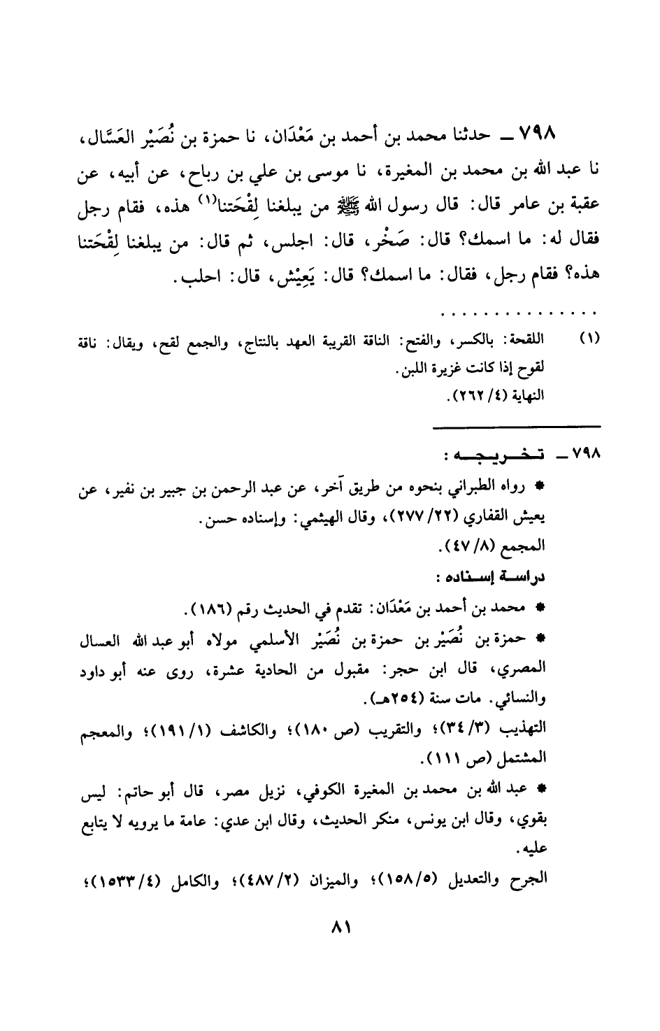 798 - حَدَّثَنَا مُحَمَّدُ بْنُ أَحْمَدَ بْنِ مَعْدَانَ، نَا حَمْزَةُ بْنُ نُصَيْرٍ الْعَسَّالُ، نَا عَبْدُ اللَّهِ بْنُ مُحَمَّدِ بْنِ الْمُغِيرَةِ، نَا مُوسَى بْنُ عَلِيِّ بْنِ رَبَاحٍ، عَنْ أَبِيهِ، عَنْ عُقْبَةَ بْنِ عَامِرٍ، قَالَ: قَالَ رَسُولُ اللَّهِ صَلَّى اللهُ عَلَيْهِ وَسَلَّمَ: §مَنْ يُبَلِّغُنَا لِقَحْتَنَا هَذِهِ؟ فَقَامَ رَجُلٌ، فَقَالَ لَهُ: مَا اسْمُكَ؟ قَالَ: صَخْرٌ قَالَ: اجْلِسْ، ثُمَّ قَالَ: مَنْ يُبَلِّغُنَا لِقْحَتَنَا هَذِهِ؟ فَقَامَ رَجُلٌ، فَقَالَ: مَا اسْمُكَ؟ قَالَ: يَعِيشُ قَالَ: احْلِبْ