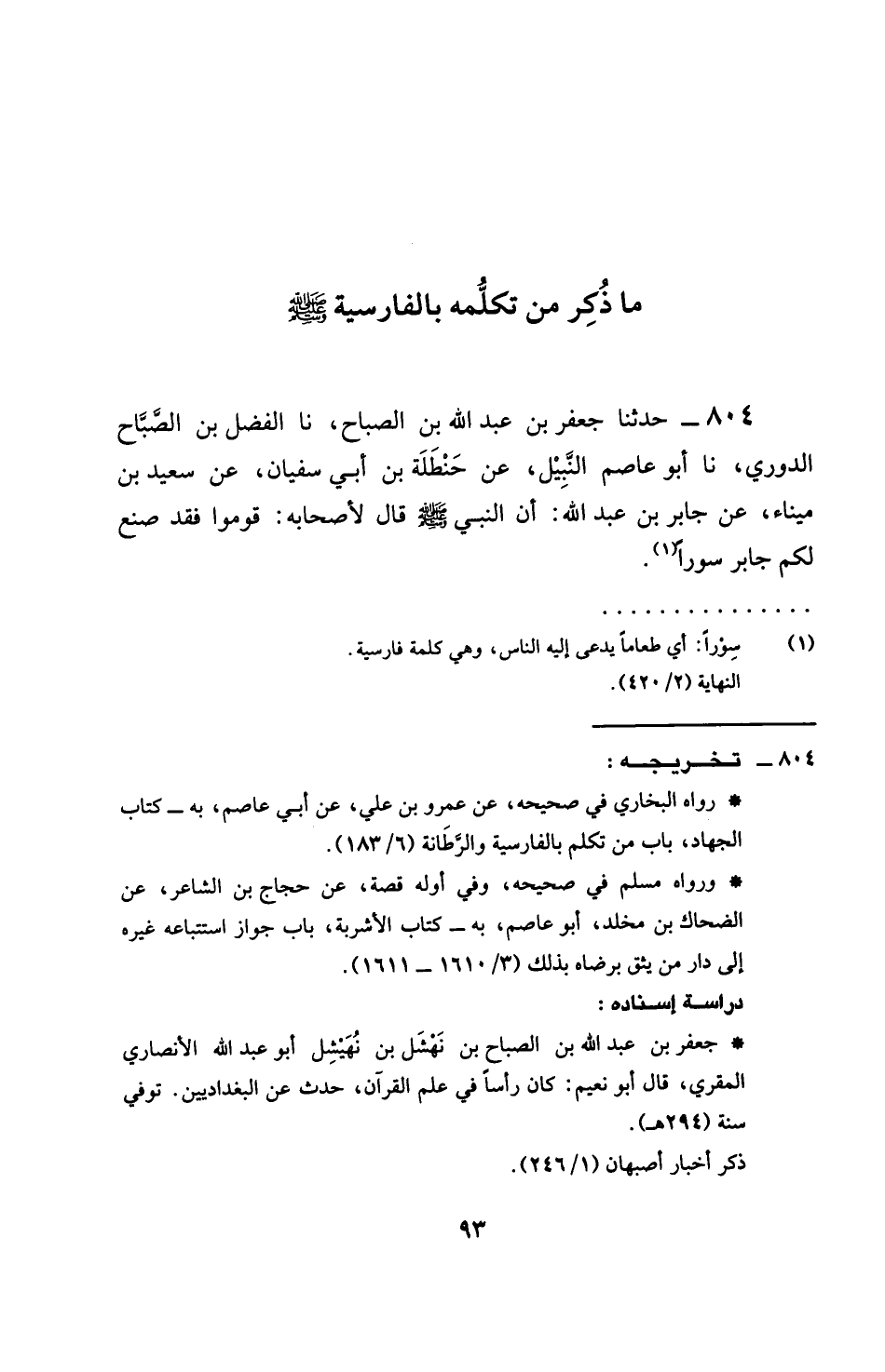 804 - حَدَّثَنَا جَعْفَرُ بْنُ عَبْدِ اللَّهِ بْنِ الصَّبَّاحِ، نَا الْفَضْلُ بْنُ الصَّبَّاحِ الدُّورِيُّ، نَا أَبُو عَاصِمٍ النَّبِيلُ، عَنْ حَنْظَلَةَ بْنِ أَبِي سُفْيَانَ، عَنْ سَعِيدِ بْنِ مِينَاءَ، عَنْ جَابِرِ بْنِ عَبْدِ اللَّهِ، أَنَّ النَّبِيَّ صَلَّى اللهُ عَلَيْهِ وَسَلَّمَ قَالَ لِأَصْحَابِهِ: §قُومُوا، فَقَدْ صَنَعَ لَكُمْ جَابِرٌ سُورًا