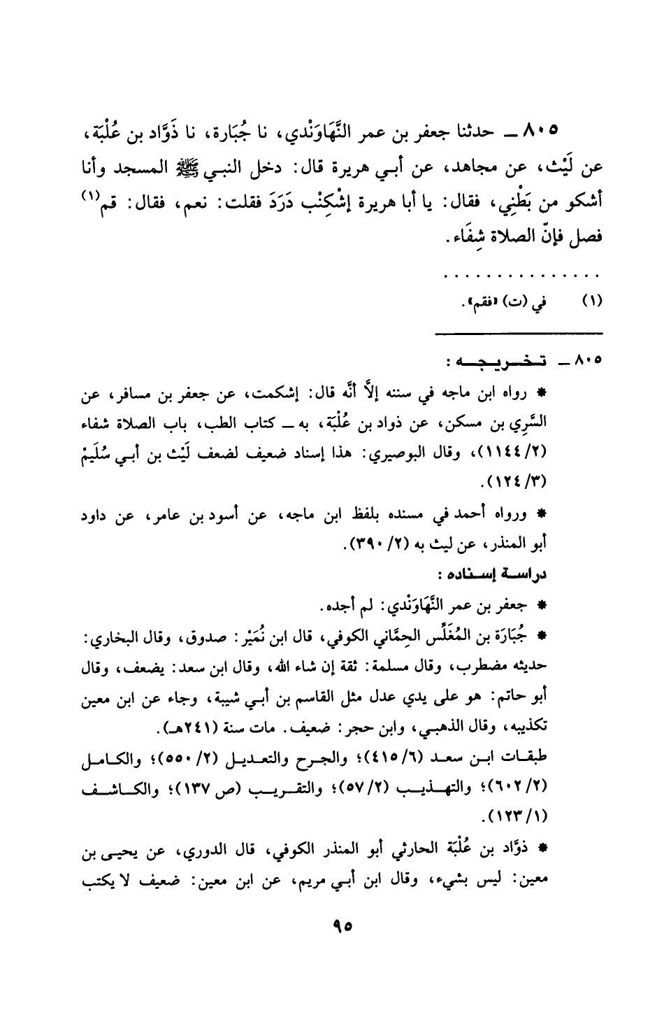 805 - حَدَّثَنَا جَعْفَرُ بْنُ عُمَرَ النَّهَاوَنْدِيُّ، نَا جُبَارَةُ، نَا ذؤادُ بْنُ عُلْبَةَ، عَنْ لَيْثٍ، عَنْ مُجَاهِدٍ، عَنْ أَبِي هُرَيْرَةَ، قَالَ: §دَخَلَ النَّبِيُّ صَلَّى اللهُ عَلَيْهِ وَسَلَّمَ الْمَسْجِدَ وَأَنَا أَشْكُو مِنْ بَطْنِي، فَقَالَ: يَا أَبَا هُرَيْرَةَ اشْكنب درد، فَقُلْتُ: نَعَمْ، فَقَالَ: قُمْ فَصَلِّ، فَإِنَّ فِي الصَّلَاةِ شِفَاءٌ