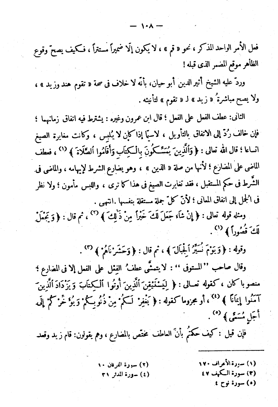 الثَّانِي: عَطْفُ الْفِعْلِ عَلَى الْفِعْلِ قَالَ ابْنُ عَمْرُونٍ وَغَيْرُهُ يُشْتَرَطُ فِيهِ اتِّفَاقُ زَمَانِهِمَا فَإِنْ خَالَفَ رد إلى الاتفاق بالتأويل لاسيما إِذَا كَانَ لَا يُلْبِسُ وَكَانَتْ مُغَايَرَةُ الصِّيَغِ اتِّسَاعًا قَالَ اللَّهُ تَعَالَى: {وَالَّذِينَ يُمَسِّكُونَ بِالْكِتَابِ وأقاموا الصلاة} عطف الْمَاضِيَ عَلَى الْمُضَارِعِ لِأَنَّهَا مِنْ صِلَةِ الَّذِينَ وَهُوَ يُضَارِعُ الشَّرْطَ لِإِيهَامِهِ وَالْمَاضِي فِي الشَّرْطِ فِي حُكْمِ الْمُسْتَقْبَلِ فَقَدْ تَغَايَرَتِ الصِّيَغُ فِي هَذَا كَمَا تَرَى وَاللَّبْسُ مَأْمُونٌ وَلَا نَظَرَ فِي الْجُمَلِ إِلَى اتِّفَاقِ الْمَعَانِي لِأَنَّ كُلَّ جُمْلَةٍ مُسْتَقِلَّةٍ بِنَفْسِهَا انْتَهَى
