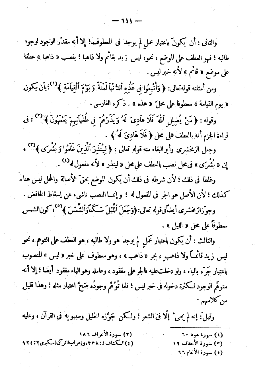 وَجَعَلَ الزَّمَخْشَرِيُّ وَأَبُو الْبَقَاءِ مِنْهُ قَوْلَهُ تَعَالَى: {لِيُنْذِرَ الَّذِينَ ظَلَمُوا وَبُشْرَى} إِنَّ بُشْرَى فِي مَحَلِّ نَصْبٍ بِالْعَطْفِ عَلَى مَحَلِّ لِيُنْذِرَ لِأَنَّهُ مَفْعُولٌ لَهُ