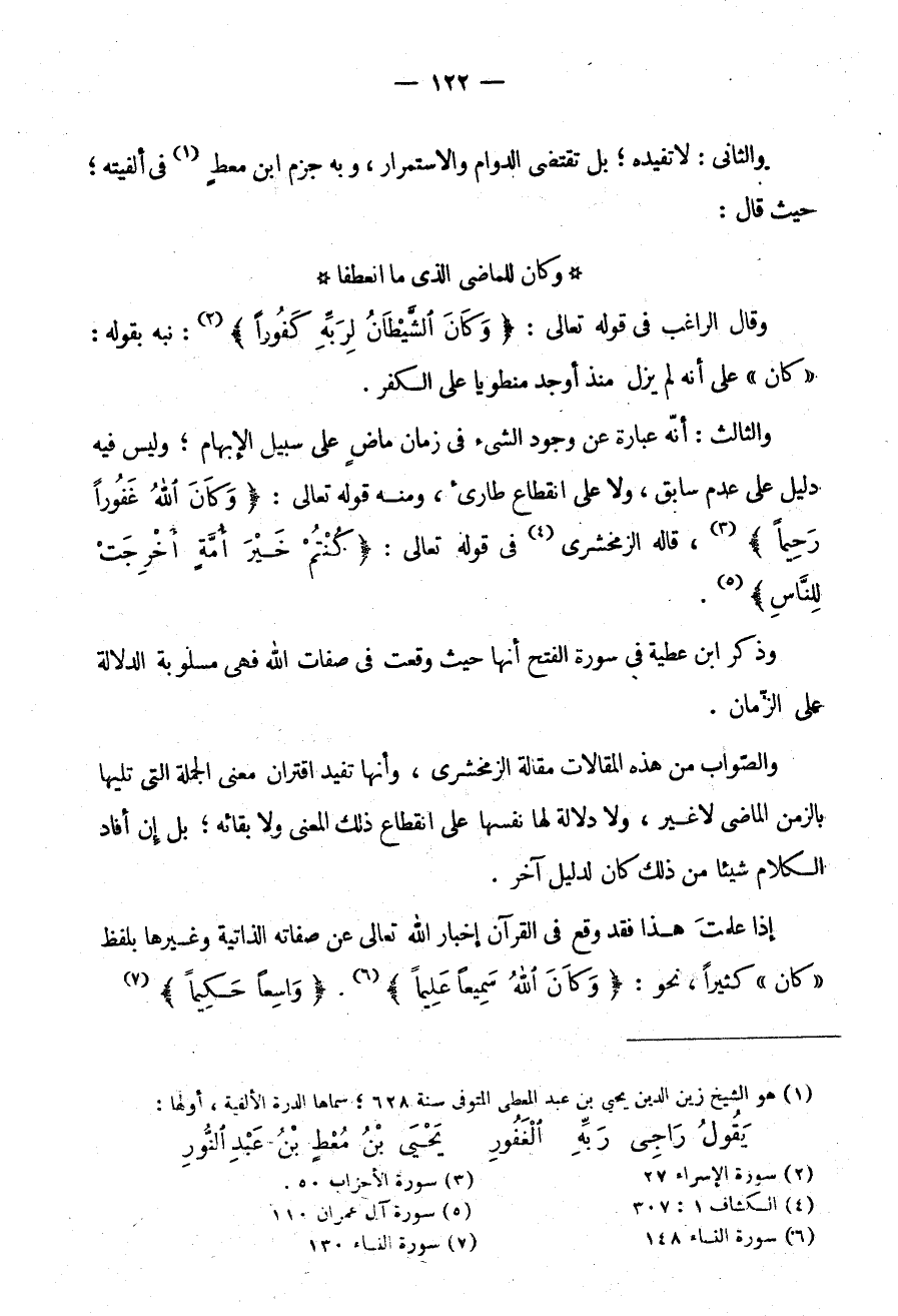 إِذَا عَلِمْتَ هَذَا فَقَدَ وَقَعَ فِي الْقُرْآنِ إِخْبَارُ اللَّهِ تَعَالَى عَنْ صِفَاتِهِ الذَّاتِيَّةِ وَغَيْرِهَا بِلَفْظِ كَانَ كَثِيرًا نَحْوُ {وَكَانَ اللَّهُ سَمِيعًا عليما} {واسعا حكيما}