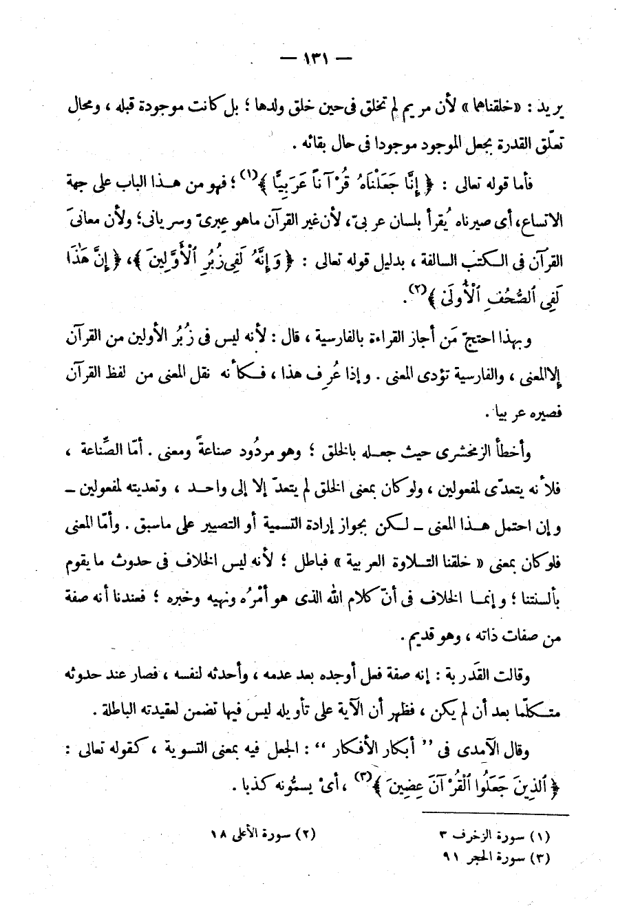 وَأَخْطَأَ الزَّمَخْشَرِيُّ حَيْثُ جَعَلَهُ بِالْخَلْقِ وَهُوَ مَرْدُودٌ صِنَاعَةً وَمَعْنًى أَمَّا الصِّنَاعَةُ فَلِأَنَّهُ يَتَعَدَّى لِمَفْعُولَيْنِ وَلَوْ كَانَ بِمَعْنَى الْخَلْقِ لَمْ يَتَعَدَّ إِلَّا إِلَى وَاحِدٍ وَتَعْدِيَتُهُ لِمَفْعُولَيْنِ وَإِنِ احْتَمَلَ هَذَا الْمَعْنَى لَكِنْ بِجَوَازِ إِرَادَةِ التَّسْمِيَةِ أَوِ التَّصْيِيرِ عَلَى مَا سَبَقَ وَأَمَّا الْمَعْنَى فَلَوْ كَانَ بِمَعْنَى خَلَقْنَا التِّلَاوَةَ الْعَرَبِيَّةَ فَبَاطِلٌ لِأَنَّهُ لَيْسَ الْخِلَافُ فِي حُدُوثِ مَا يَقُومُ بِأَلْسِنَتِنَا وَإِنَّمَا الْخِلَافُ فِي أَنَّ كَلَامَ اللَّهِ الَّذِي هُوَ أَمْرُهُ وَنَهْيُهُ وَخَبَرُهُ فَعِنْدَنَا أَنَّهُ صِفَةٌ مِنْ صِفَاتِ ذَاتِهِ وَهُوَ قَدِيمٌ