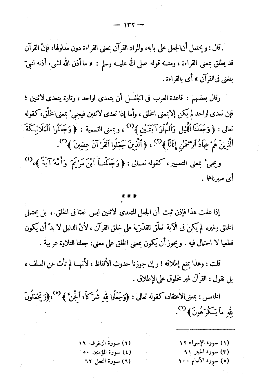 إذا علمت هذا فإذن ثَبَتَ أَنَّ الْجَعْلَ الْمُتَعَدِّيَ لِاثْنَيْنِ لَيْسَ نَصًّا فِي الْخَلْقِ بَلْ يَحْتَمِلُ الْخَلْقَ وَغَيْرَهُ وَلَمْ يَكُنْ فِي الْآيَةِ تَعَلُّقٌ لِلْقَدَرِيَّةِ عَلَى خَلْقِ القرآن لأن الدليل لابد أَنْ يَكُونَ قَطْعِيًّا لَا احْتِمَالَ فِيهِ وَيَجُوزُ أَنْ يَكُونَ بِمَعْنَى الْخَلْقِ عَلَى مَعْنَى جَعَلْنَا التِّلَاوَةَ عَرَبِيَّةً